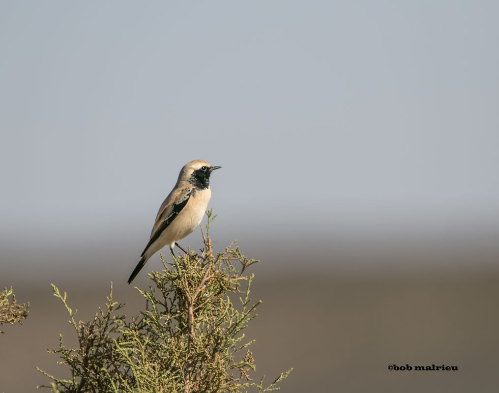 Photo prise le 19/02/2015. Espèce originaire des régions arides et sablonneuses d'Afrique du Nord et du Moyen-Orient et rarissime en Europe. Ce mâle a été signalé la première fois le 24/12/2014. Notons que deux autres oiseaux avaient été observés à Digulleville (Manche) en décembre 2013 et à Ploudalmézeau (Finistère) en décembre 2012, toujours au bord de la mer (voir notre rubrique Observations).