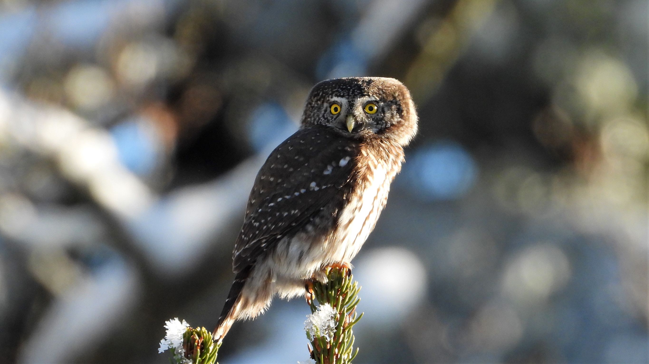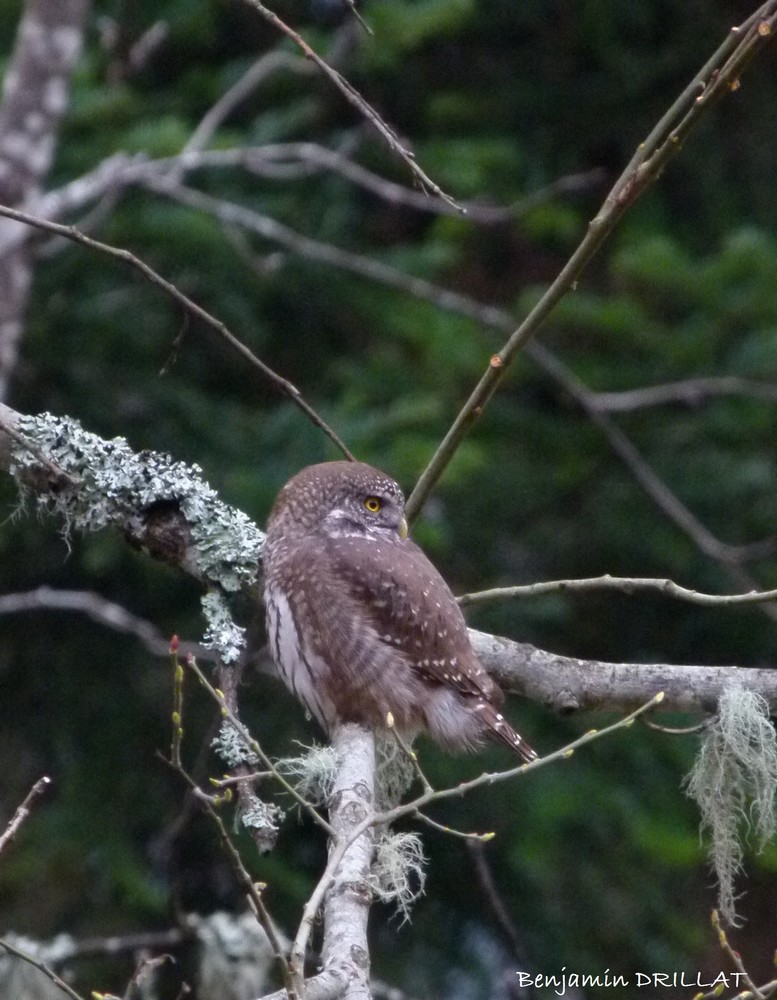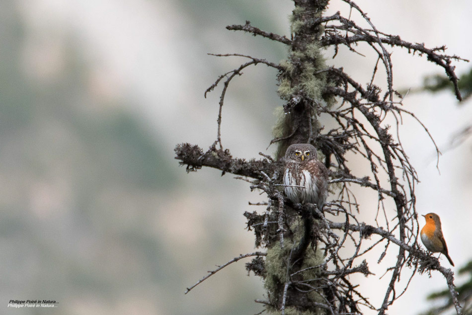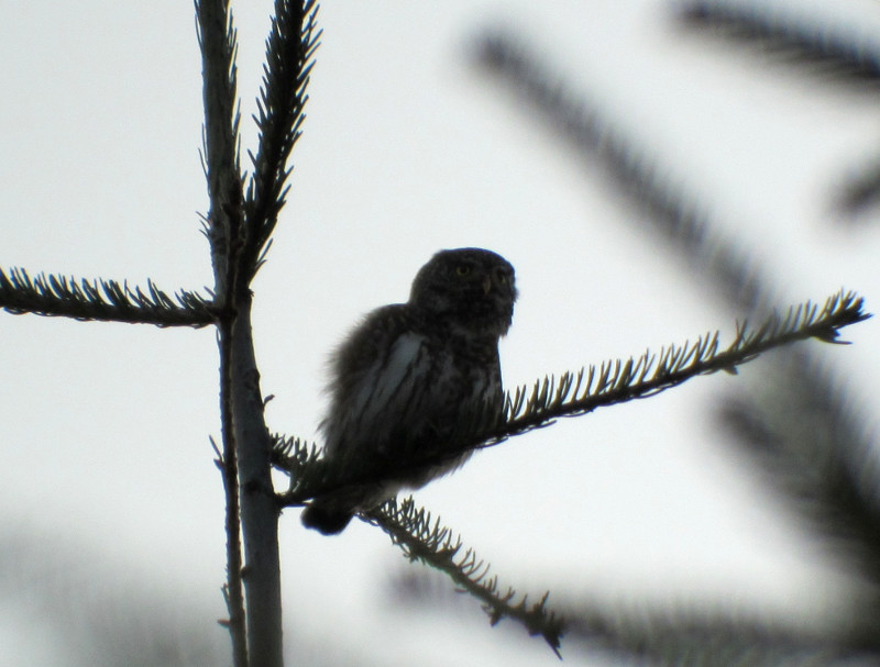 Photo prise le 10/01/2022. Houspillée par des Mésanges huppées. Lire À propos du houspillage de la Chevêchette d’Europe par les passereaux.