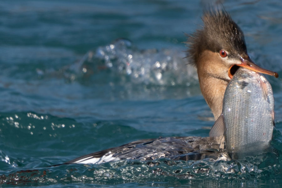 Harle huppé femelle ayant attrapé une belle Alose à gésier