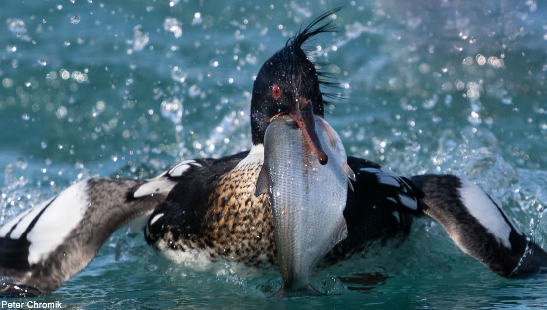 Photo prise en février 2021 par Peter Chromik (voir sa page Facebook). Ce Harle huppé mâle a attrapé cette belle Alose à gésier (Dorosoma cepedianum) puis l'a mangée !