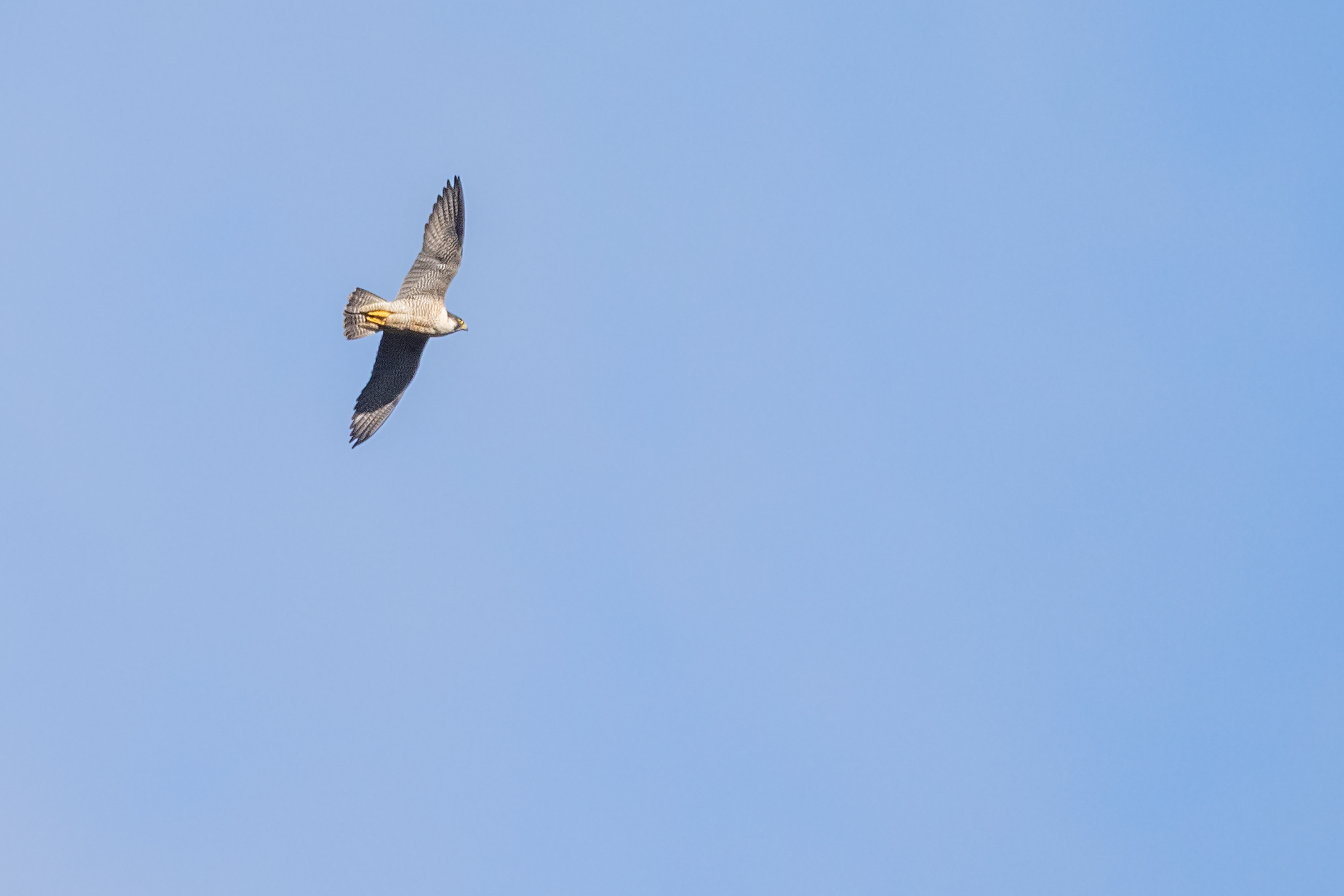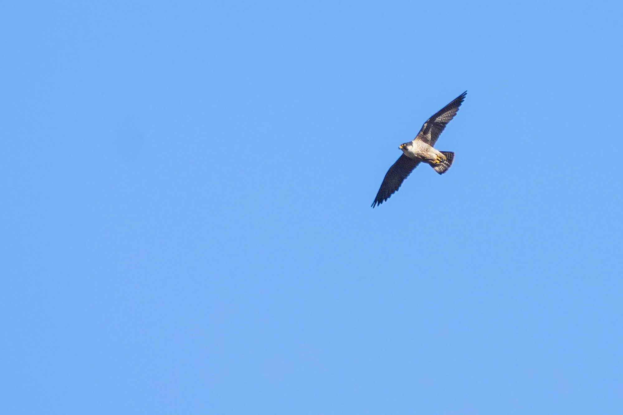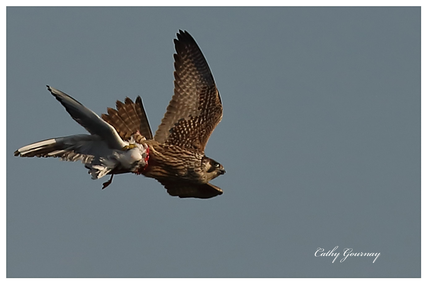 Photo prise le 11/01/2021. Ce sont les cris insistants d'un goéland qui m'ont permis d'observer le passage en vol de ce faucon pèlerin avec sa proie, une Mouette rieuse. Lire La technique de chasse du Faucon pèlerin.