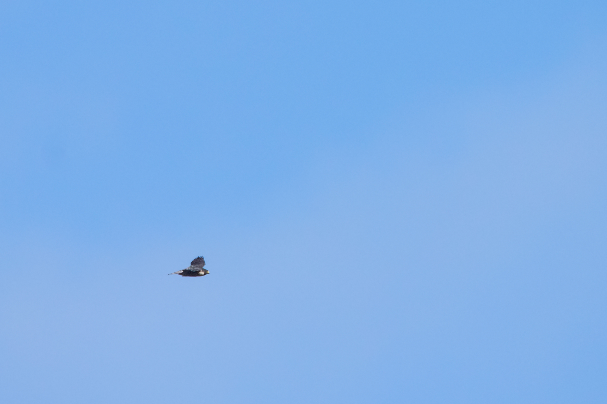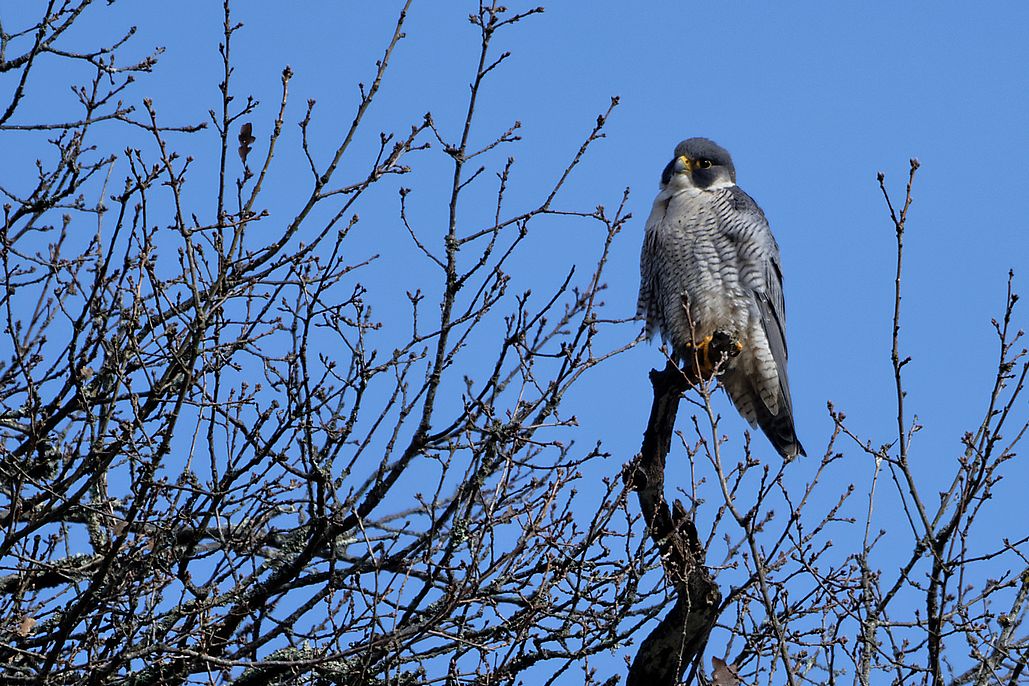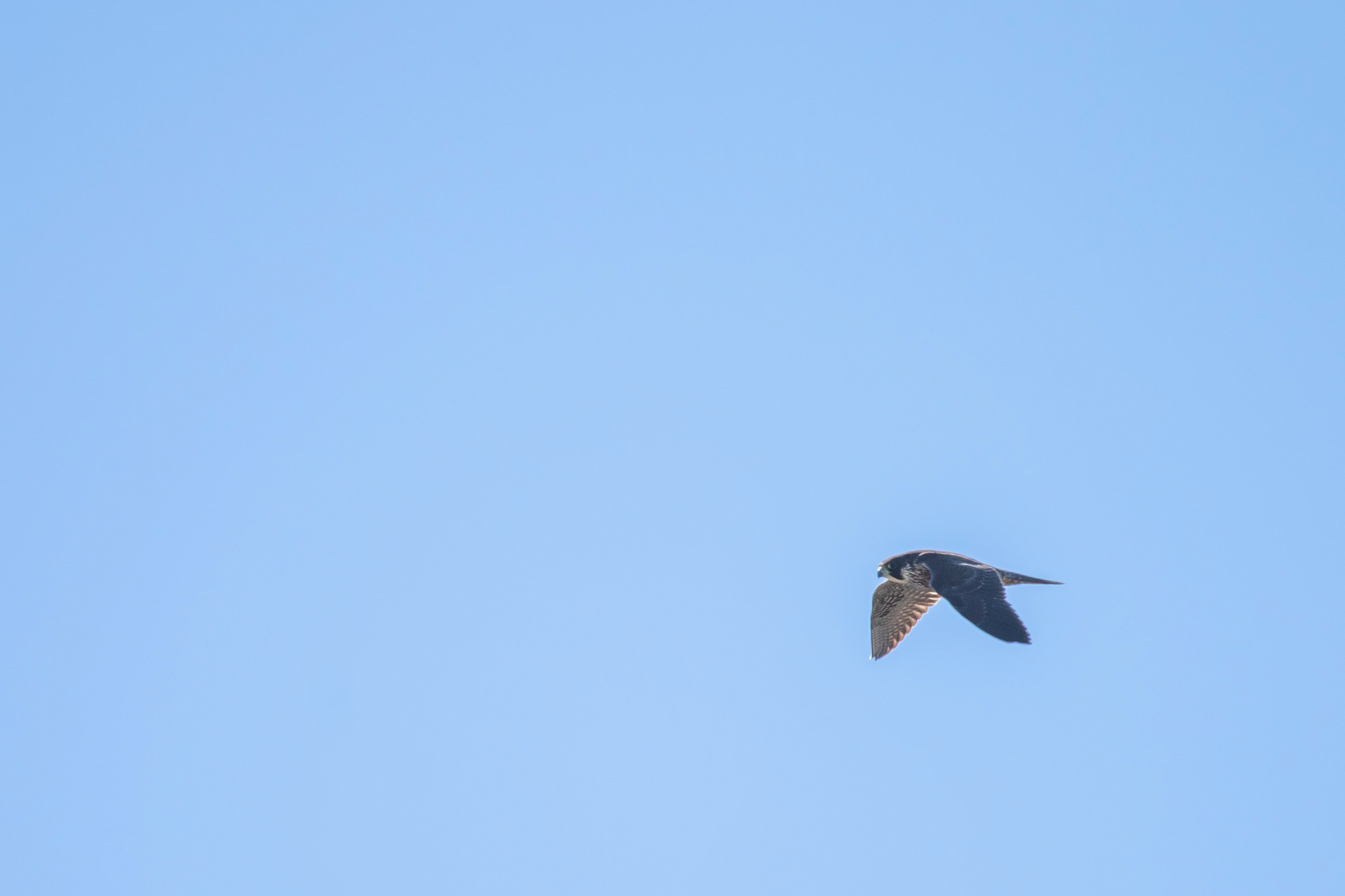 Photo prise le 11/01/2021. Ce sont les cris insistants d'un goéland qui m'ont permis d'observer le passage en vol de ce faucon pèlerin avec sa proie, une Mouette rieuse. Lire La technique de chasse du Faucon pèlerin.