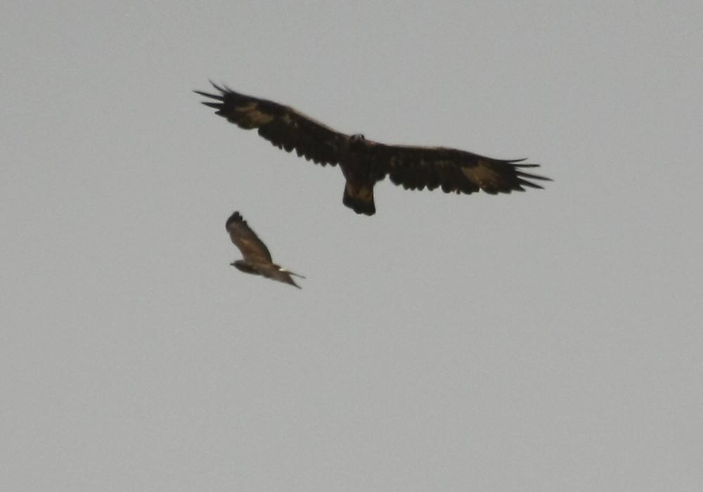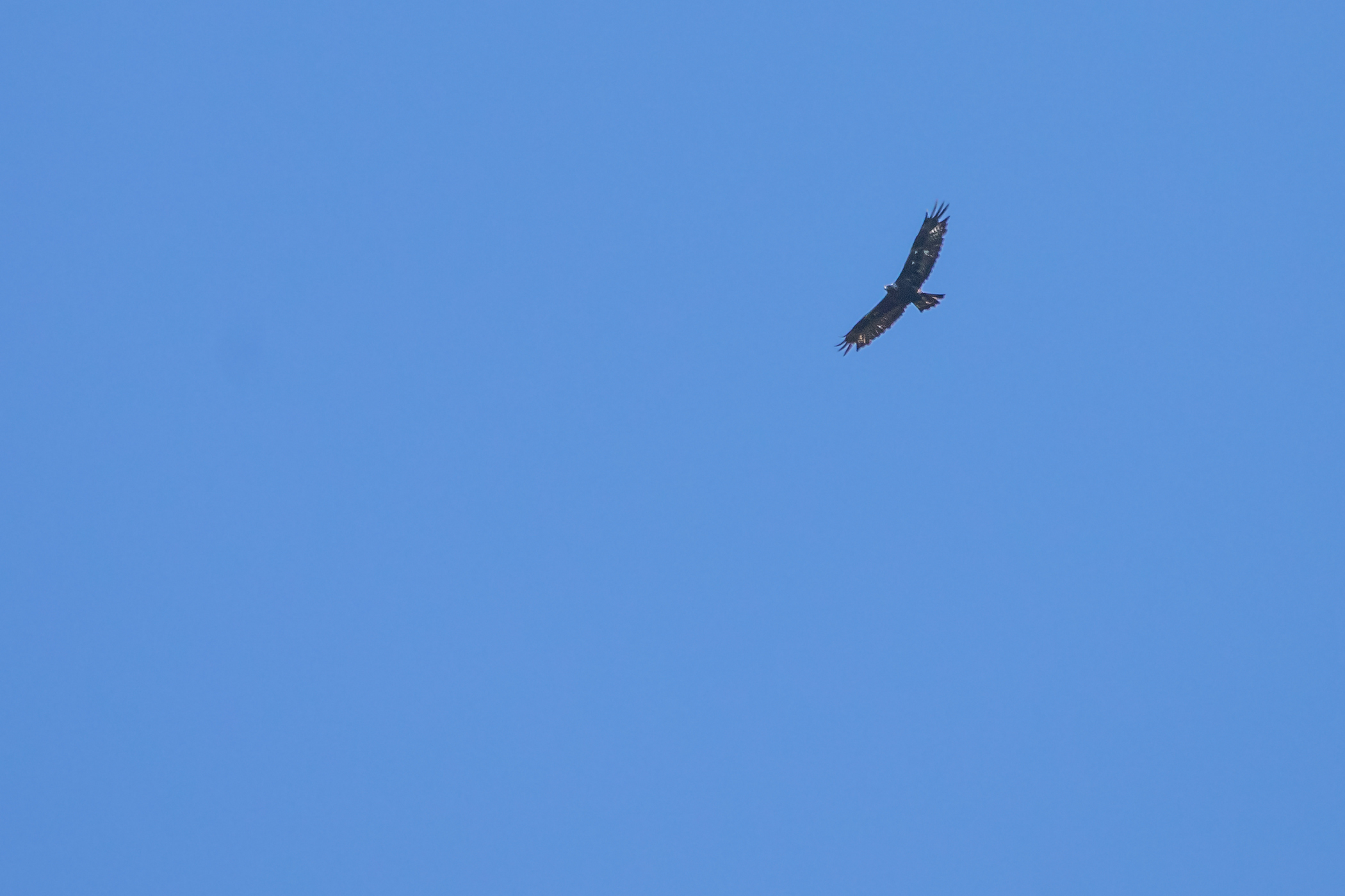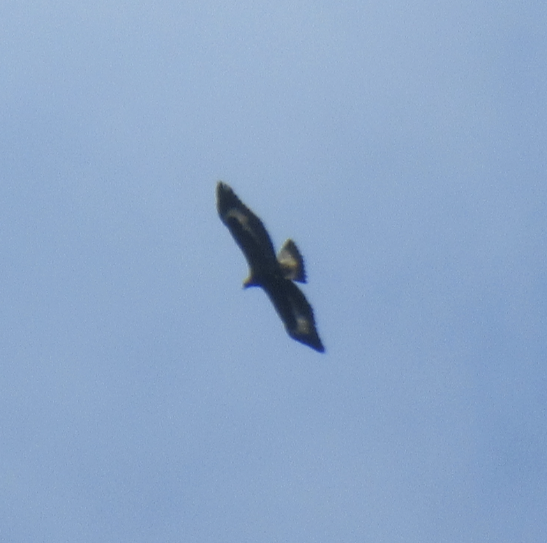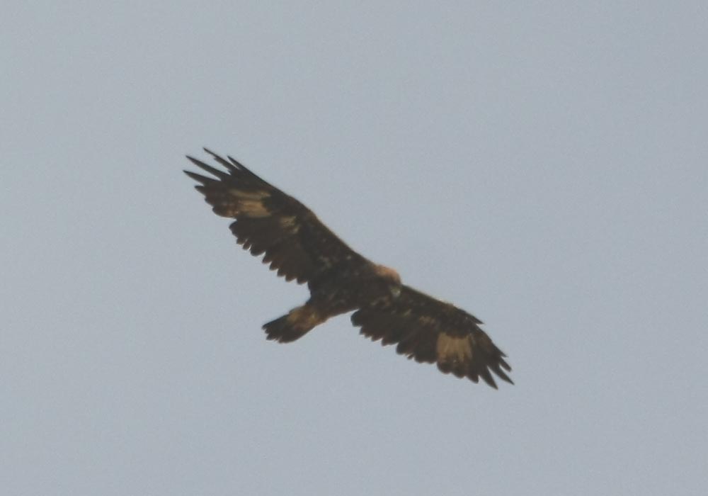Photographie prise le 22 juin 2022 par Michel Leroux. Ce grand rapace, de la taille d'un Vautour fauve (Gyps fulvus), était houspillé par des Choucas des tours (Coloeus monedula). Sa tête était très claire. Quel est votre avis sur son identification : est-ce un Aigle royal (Aquila chrysaetos) ?