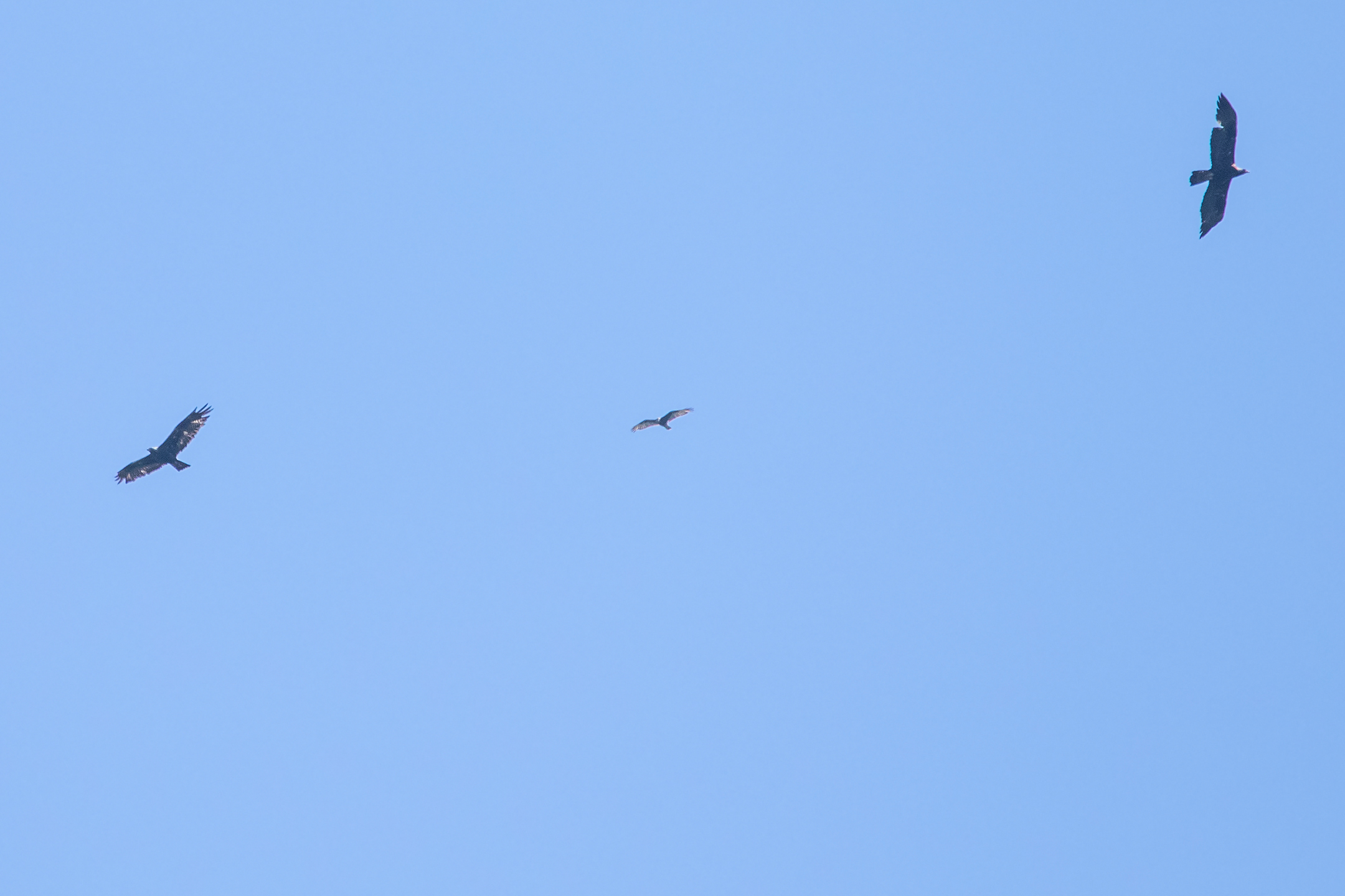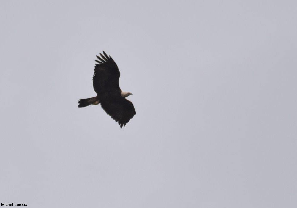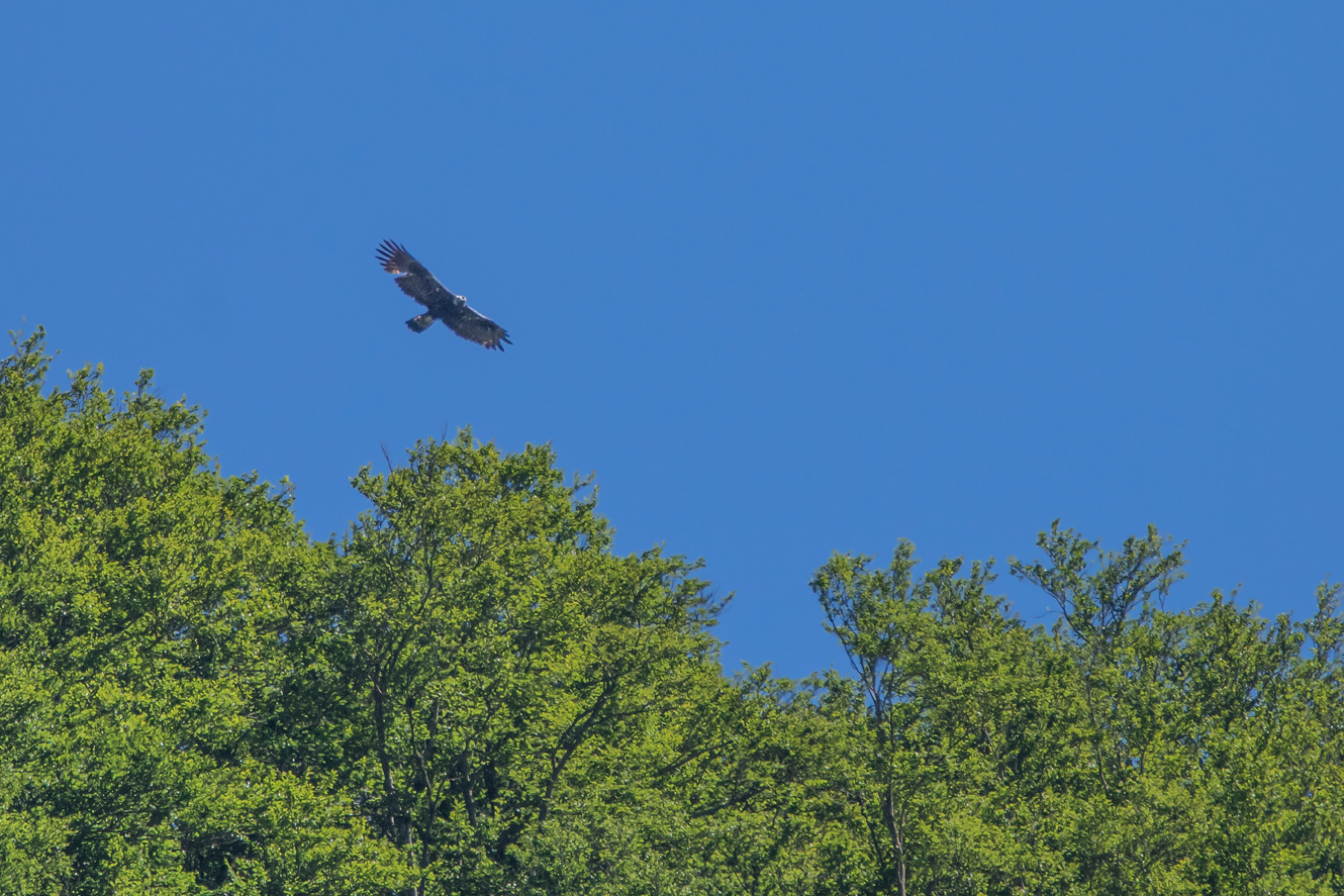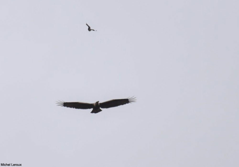 Photographie prise le 22 juin 2022 par Michel Leroux. Ce grand rapace, de la taille d'un Vautour fauve (Gyps fulvus), était houspillé par des Choucas des tours (Coloeus monedula) (lire Corvidés et rapaces : des relations difficiles).