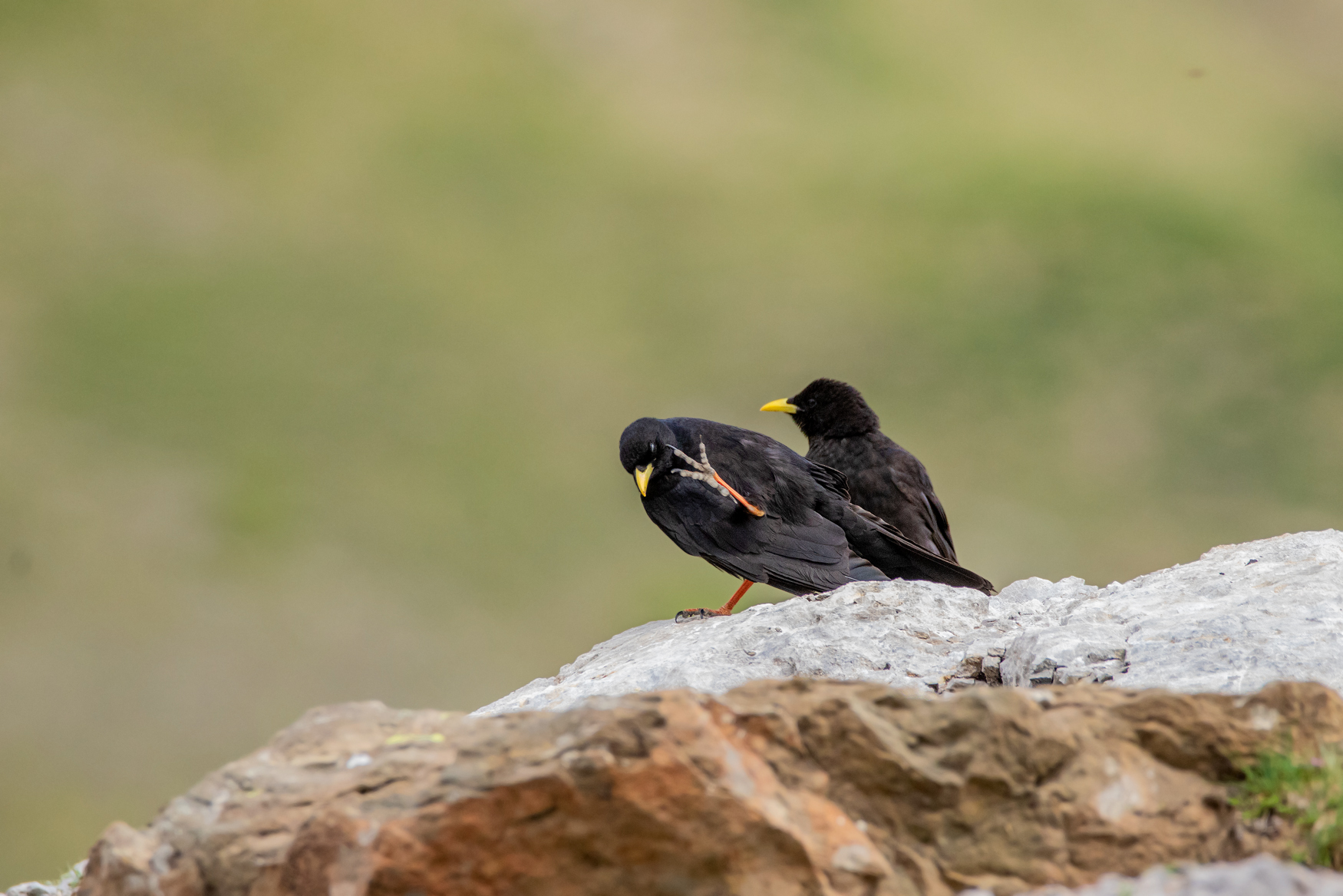 Photo prise le 08/07/2020. Ce n'est pas la peine de courir : au niveau de la station supérieure du téléphérique (El cable) de Fuente Dé, on pourrait presque les photographier avec un smartphone. Les visiteurs sont nombreux et les oiseaux profitent de l'affluence pour venir grapiller ce qu'il peuvent.