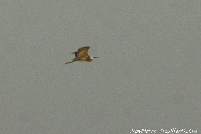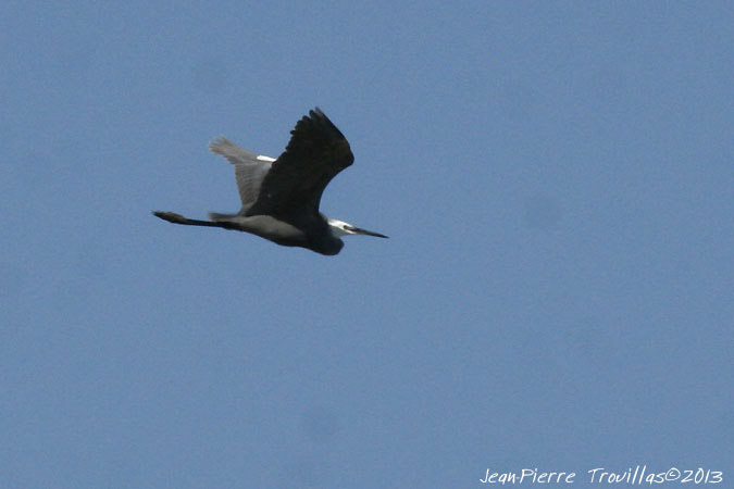 Photo : Jean-Pierre Trouillas (COGard) (visitez le site web de Jean-Pierre Trouillas) Hybride Aigrette des récifs x Aigrette garzette. Vient se poser dans le groupe d'Aigrettes garzettes, s'alimente puis s'envole vers le nord de l'étang du Charnier. Lire Identifier et chercher l'Aigrette des récifs en Europe de l'Ouest.