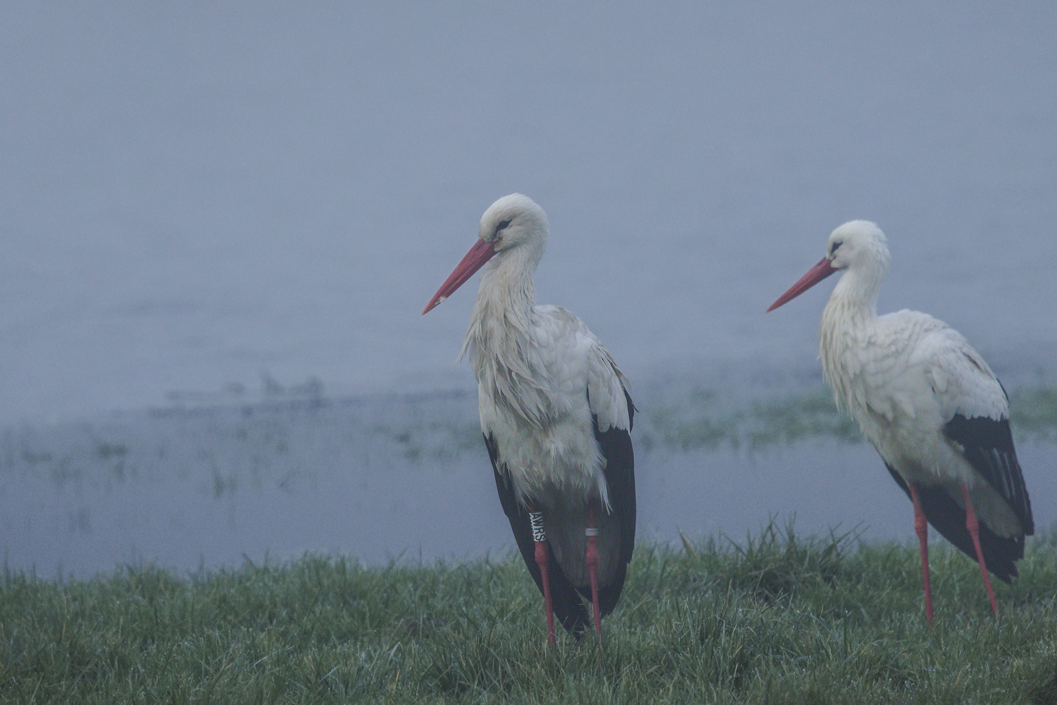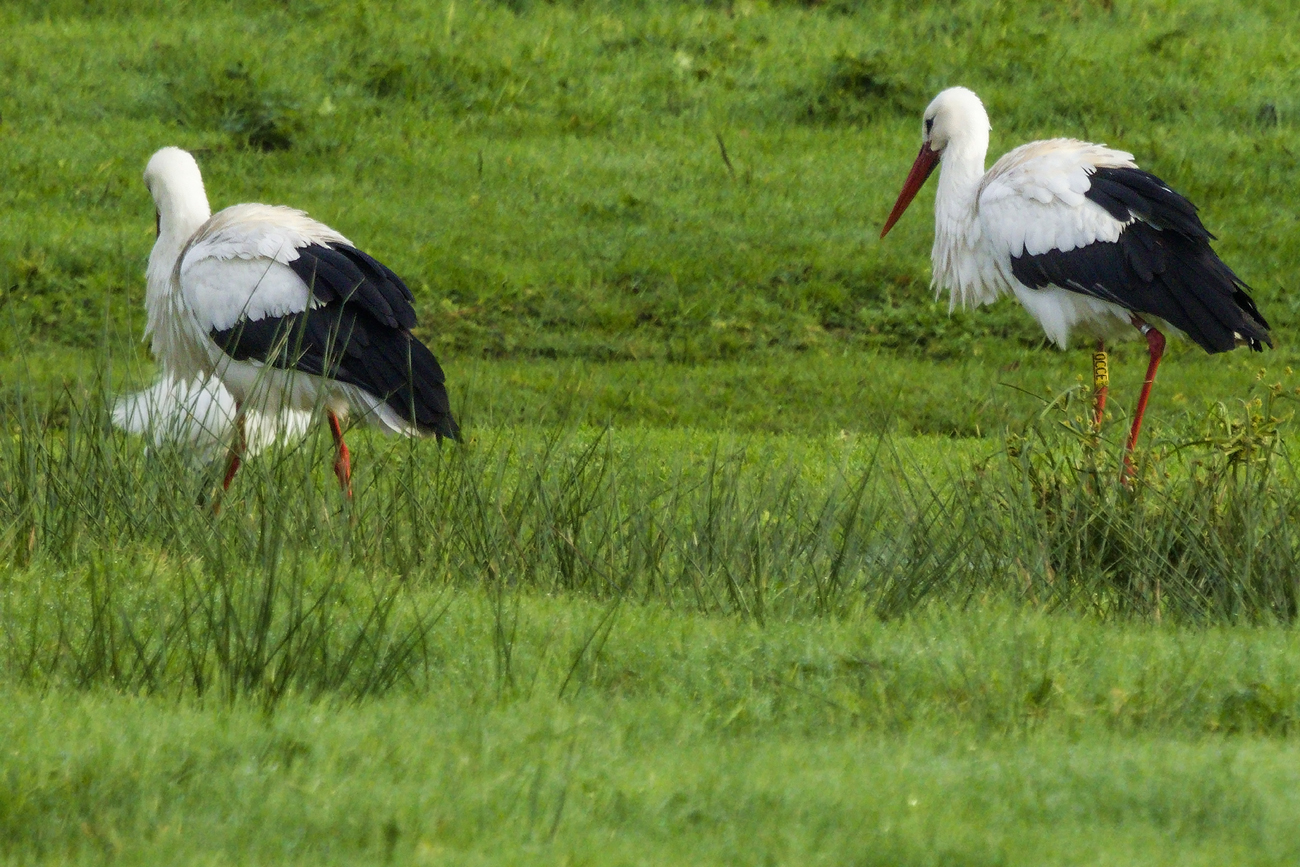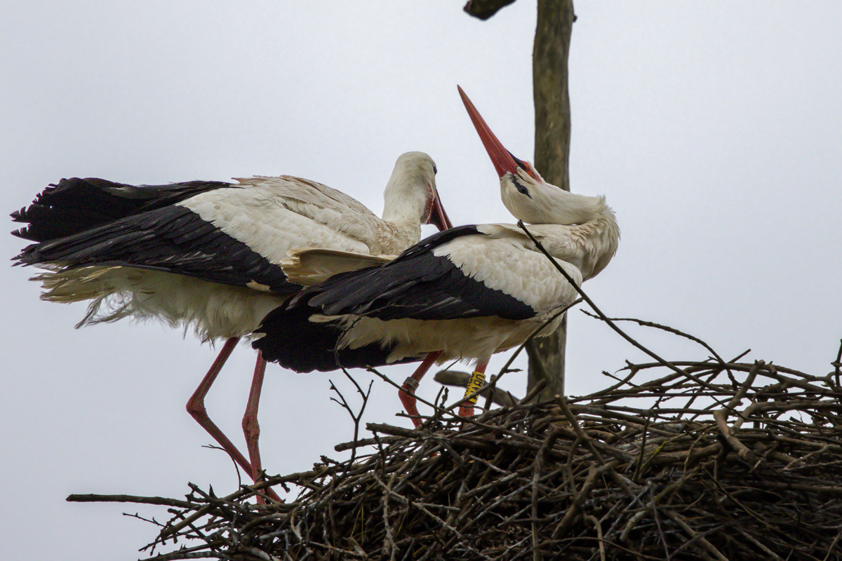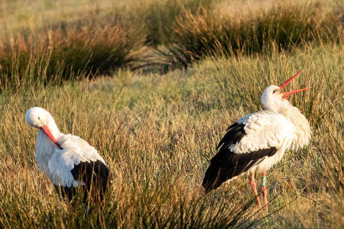Photo prise le 08/02/2023. Une cigogne avec une bague verte FASU, l'autre cigogne avec une bague argentée BPSC.