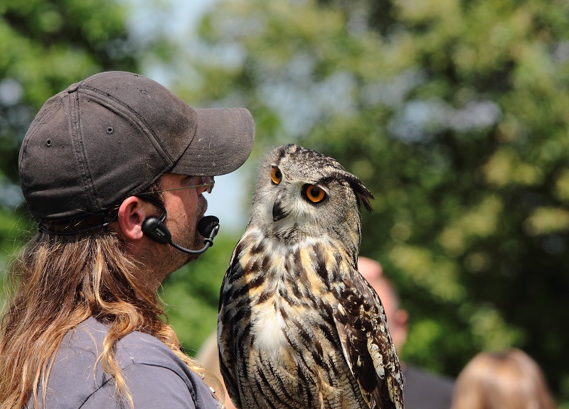 Photo prise le 26/05/2015. Cette femelle de Grand-duc d'Europe a été photographiée lors d'une manifestation de rapaces près de chez moi : notez la complicité entre l'homme et l'oiseau, une "histoire d'amour".