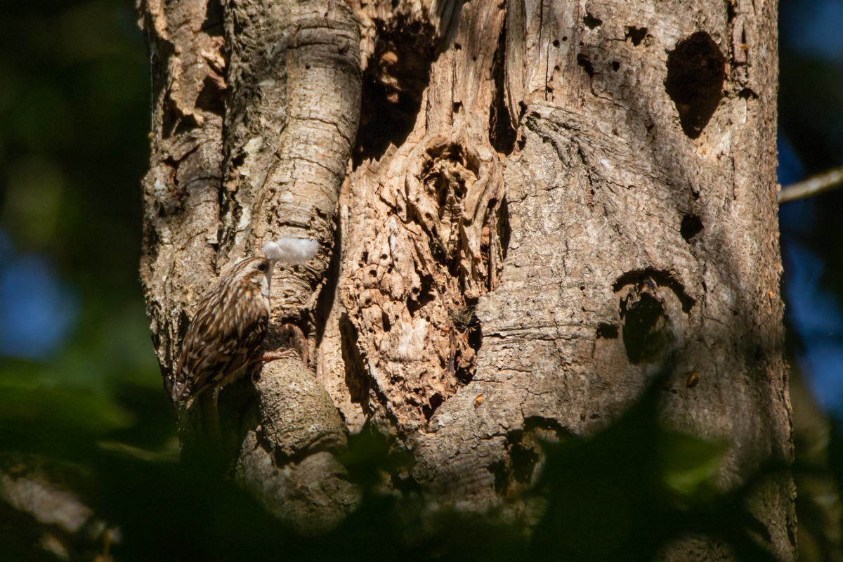 Grimpereau des jardins rentrant au nid avec une plume de duvet