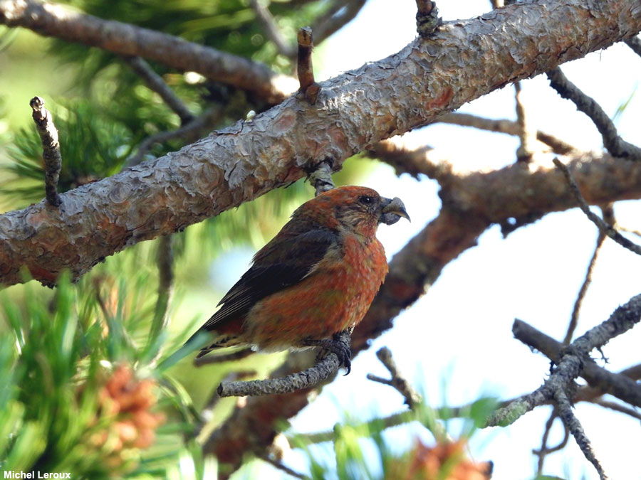 Bec-croisé des sapins mâle mangeant une pomme de pin