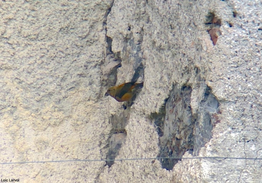 Photo prise le 26/04/2023. Ce Bec-croisé des sapins mâle a été observé deux fois dans la journée entrain de prélever du salpêtre (des minéraux) sur la façade abîmée d'un mur de maison. Lire La géophagie chez les becs-croisés et les autres passereaux.