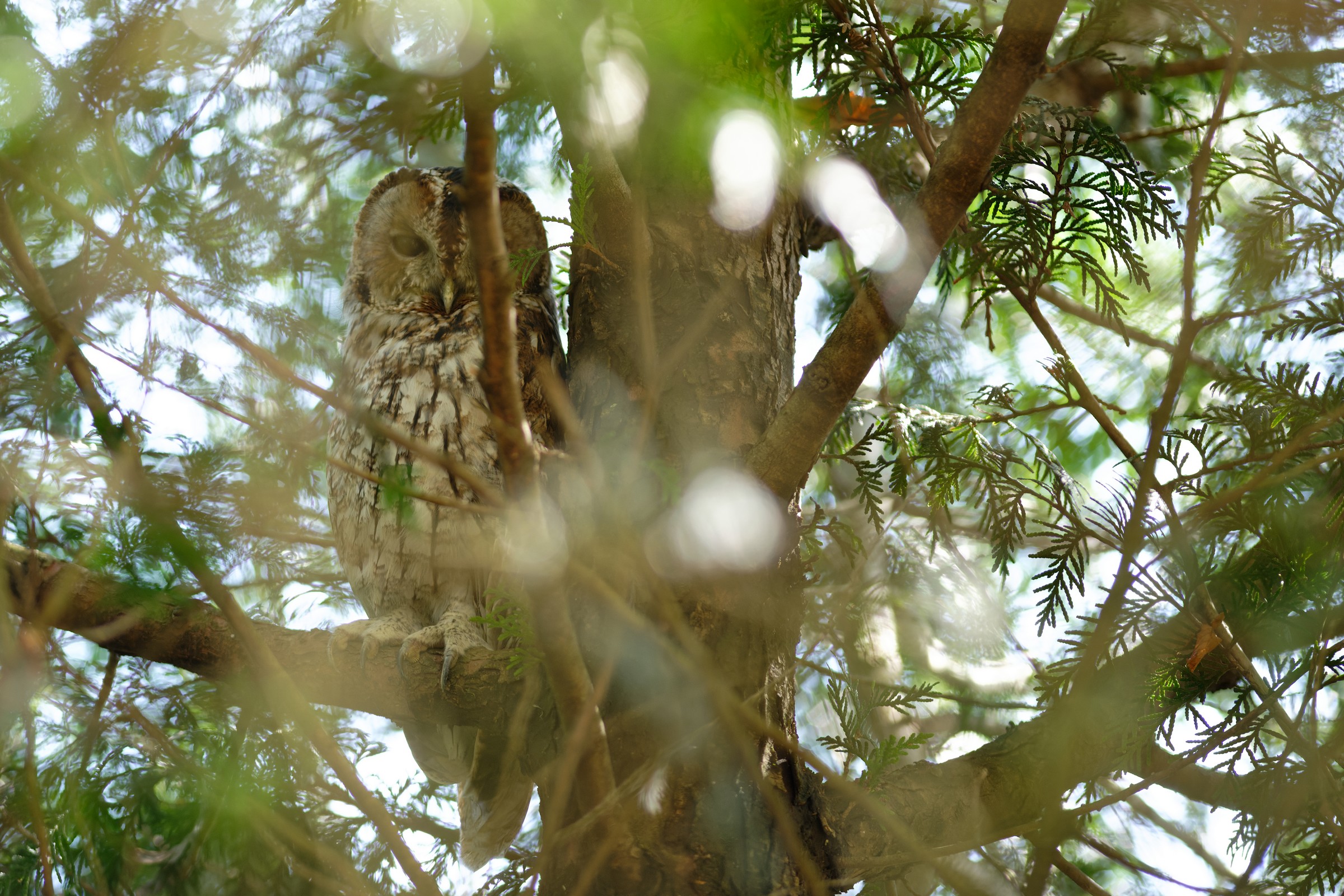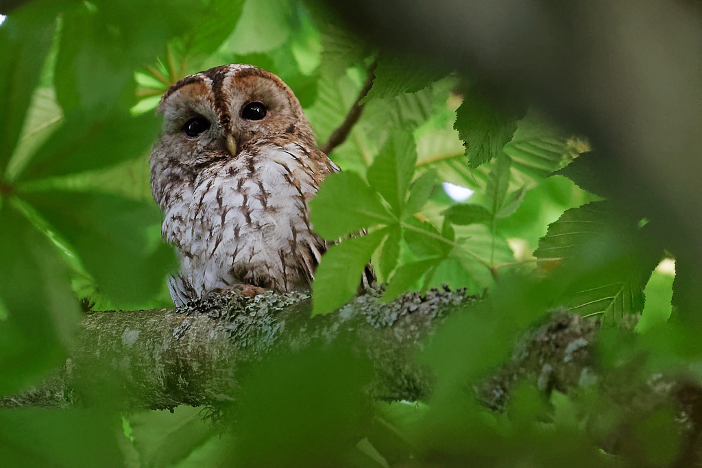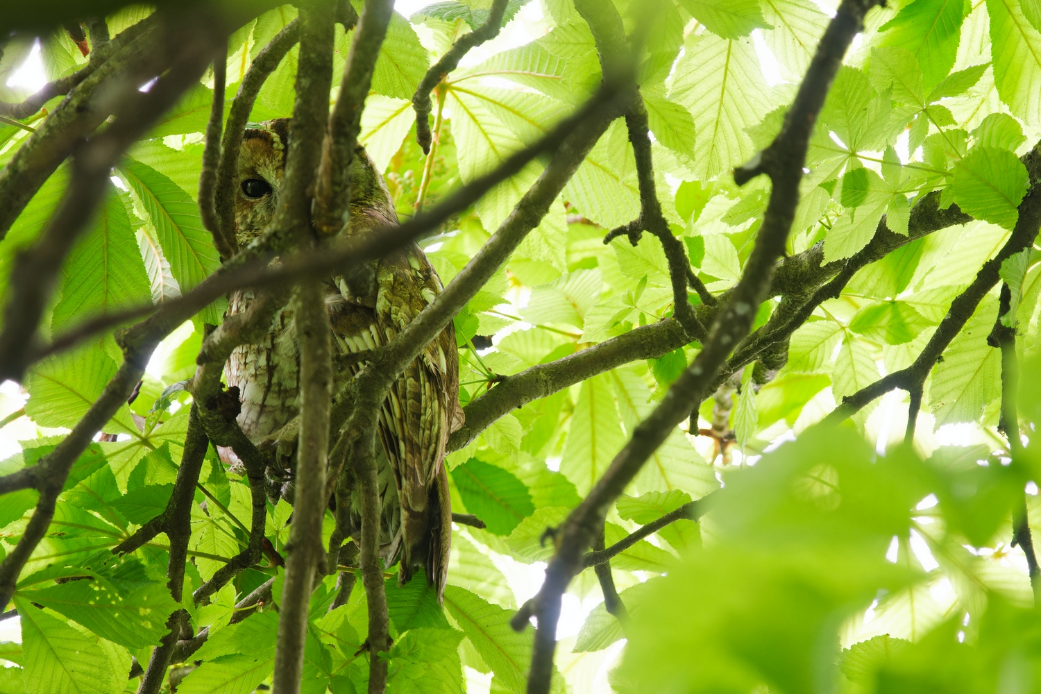 Photo prise le 25/04/2029. Cette chouette hulotte ulule régulièrement à proximité direct de la la maison. Mais je n'arrive à la voir que très occasionnellement tellement elle sait se rendre invisible. Là je l'ai aperçu dans le marronnier juste devant la maison.