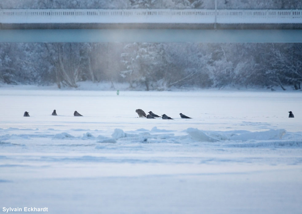 Photo prise le 20/01/2018 par Monsieur Eckhardt Sylvain. Les Corneilles mantelées essaient de profiter du Pigeon ramier tué par le jeune Autour des palombes. Lire Observer les oiseaux dans les environs d'Oulu (Finlande) et Le houspillage (ou "mobbing") chez les oiseaux.