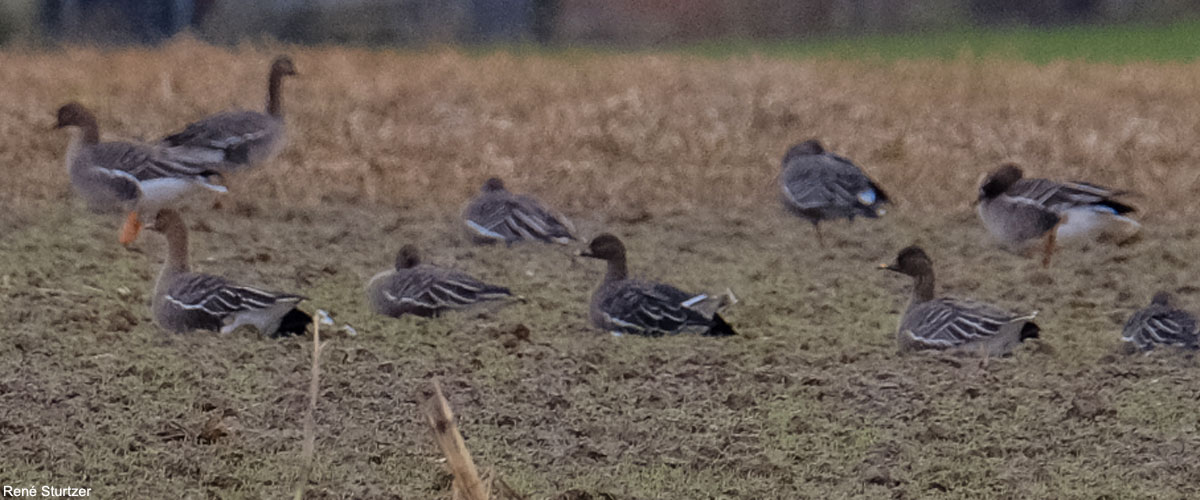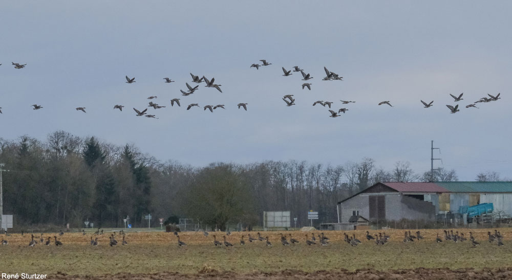 Photo prise le 31/12/2021 par René Sturtzer (visitez son blog Blog de Altenberger). Il avait ce jour-là 800 Oies des moissons de la sous-espèce rossicus/serrirostris), parfois considérée comme une espèce à part entière, l'Oie de la toundra (Anser serrirostris) (lire Distinguer les Oies cendrée, rieuse, des moissons de la taïga, de la toundra et à bec court), ainsi que 83 Cygnes chanteurs dans la réserve naturelle du delta de la Sauer (lire Observer les oiseaux en hiver dans la vallée française du Rhin).