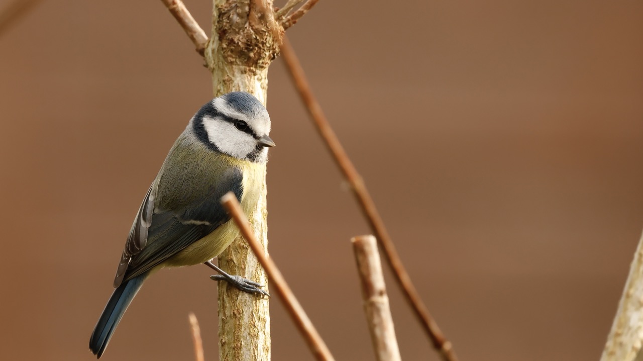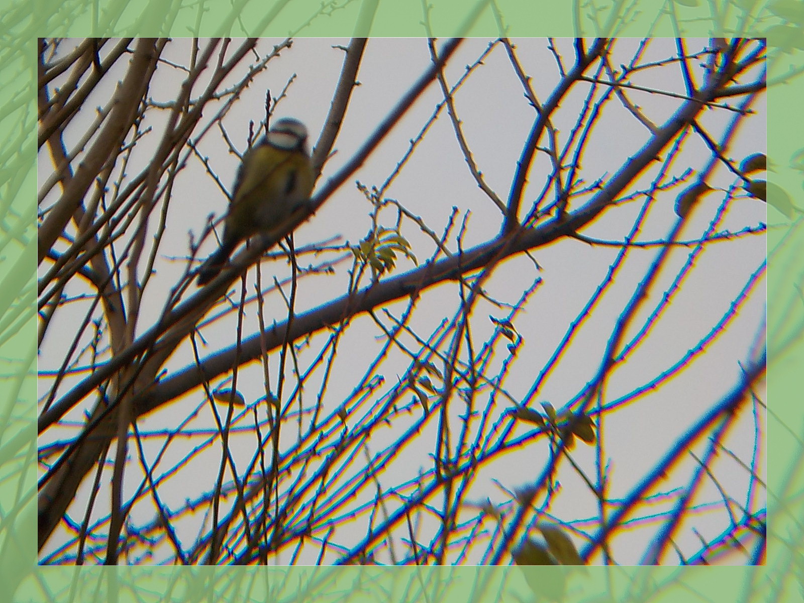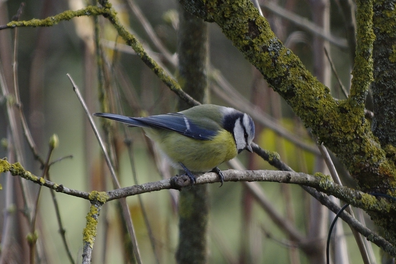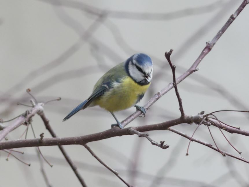 Photo prise le 17/02/2021. Mésange bleue chantant dans un petit jardin.
