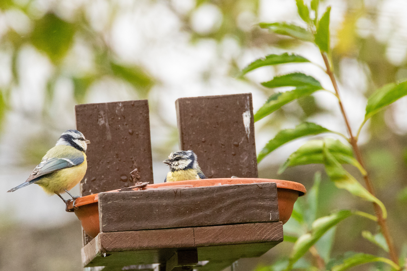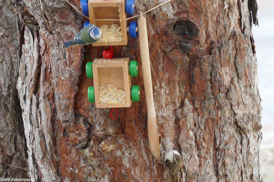 Mésange bleue et Grimpereau des bois près d’une mangeoire « maison »