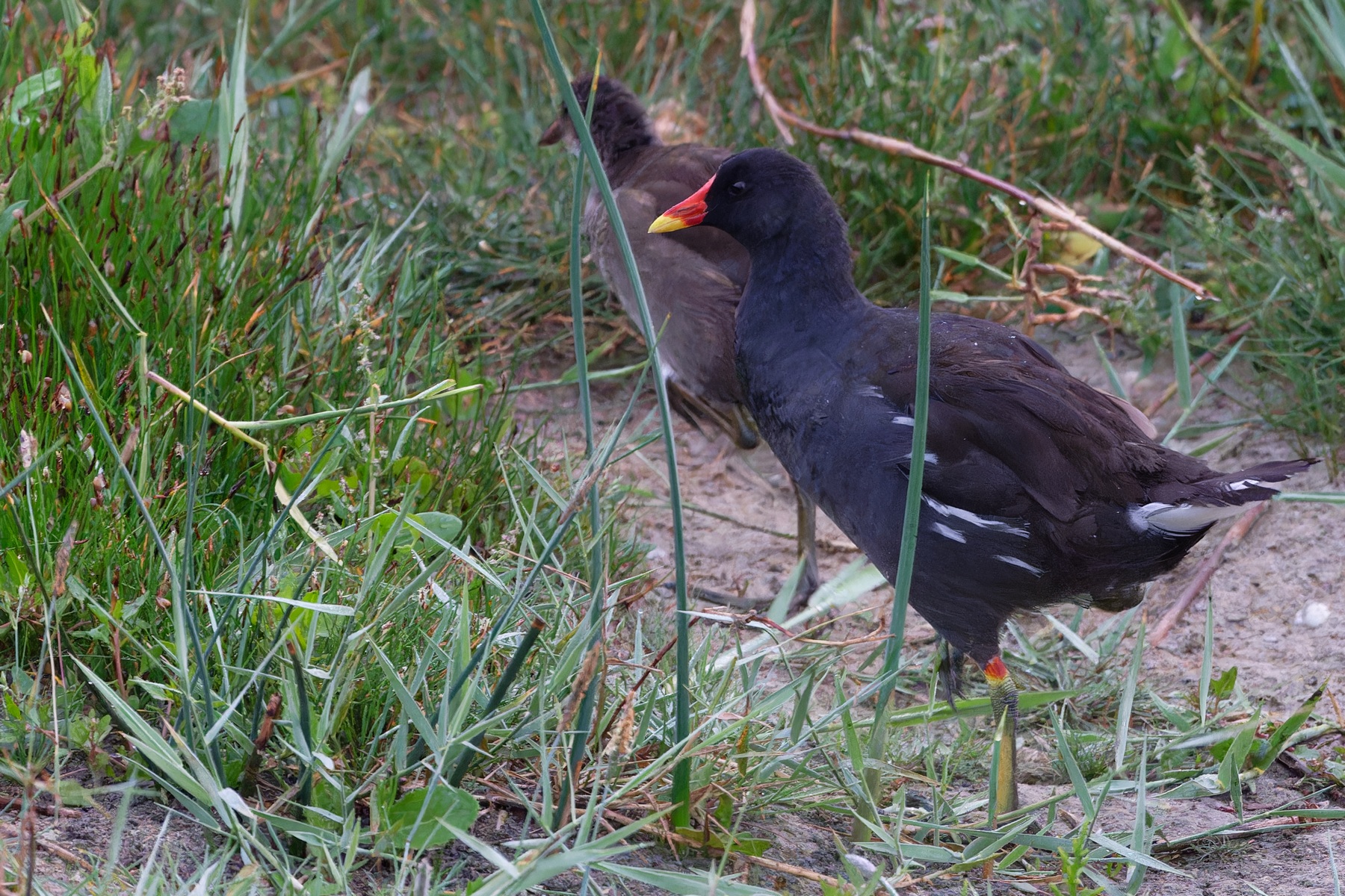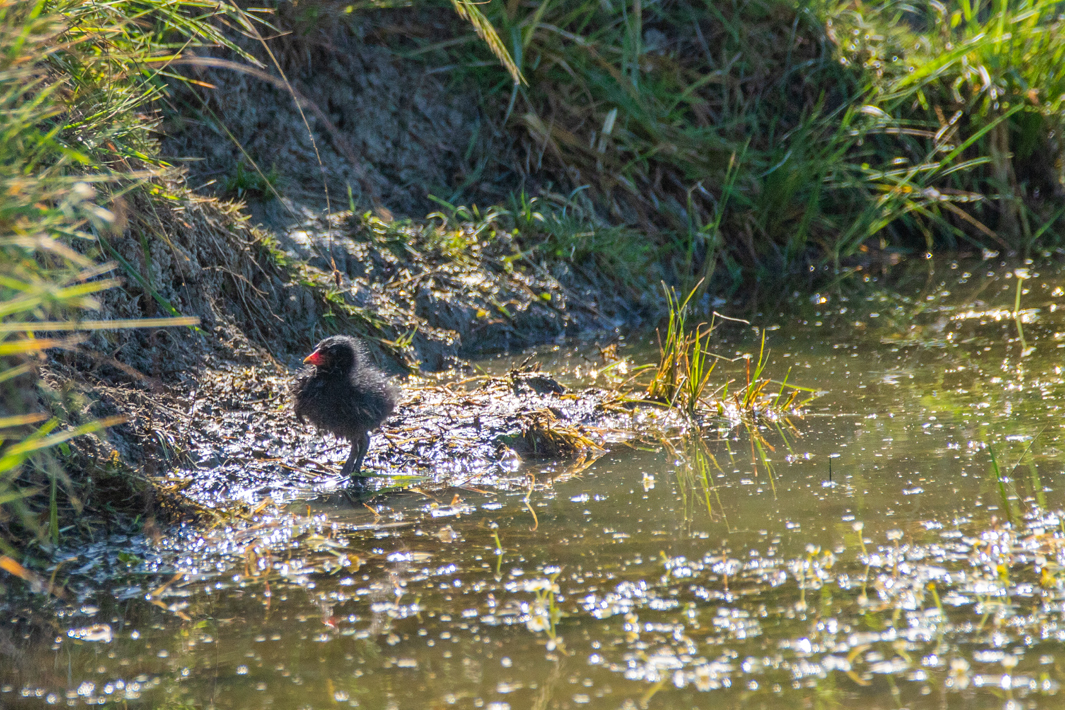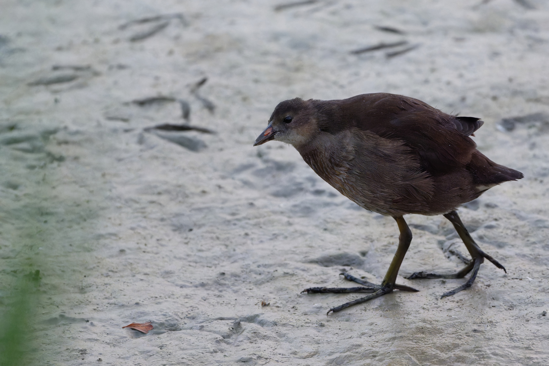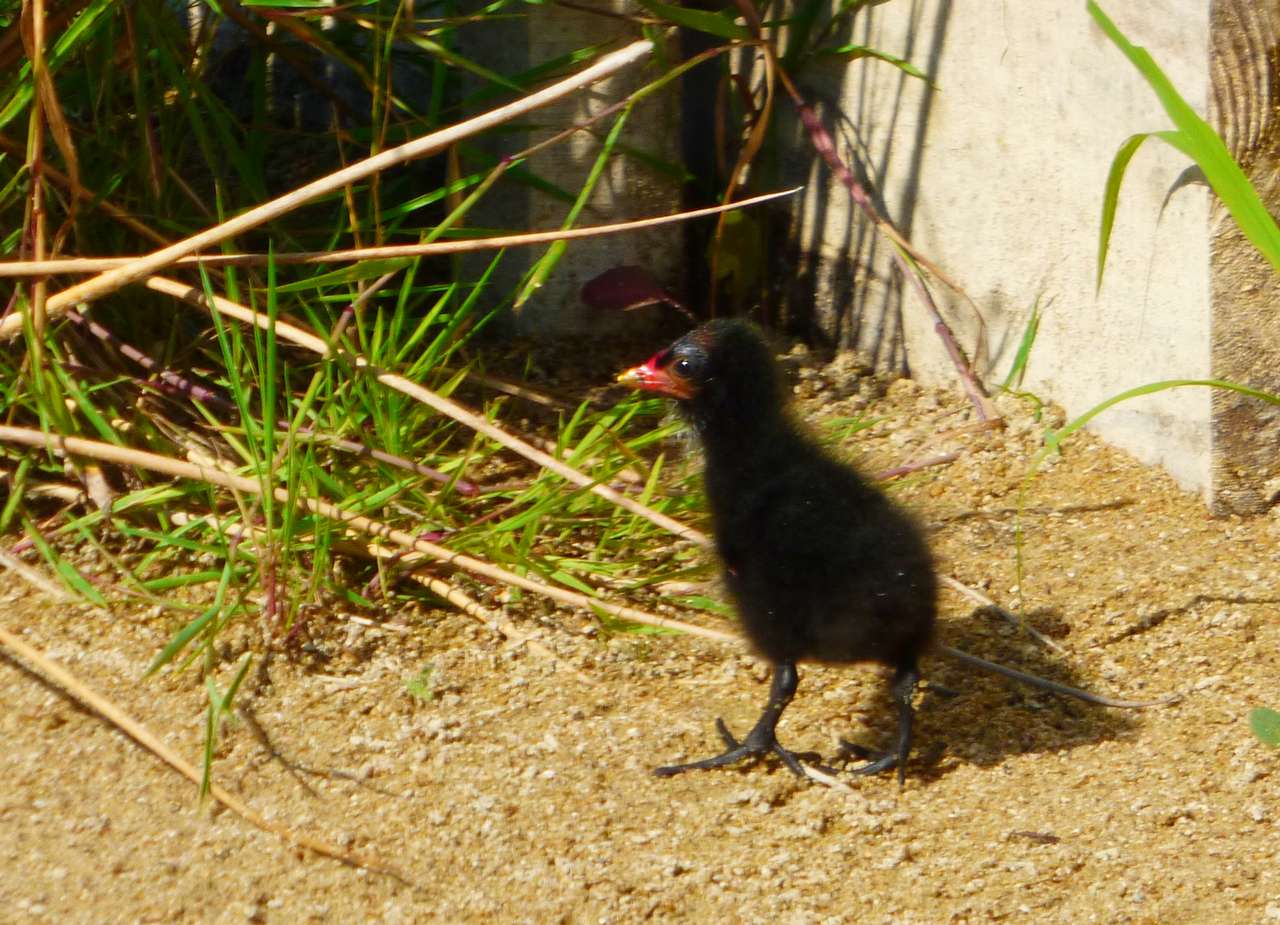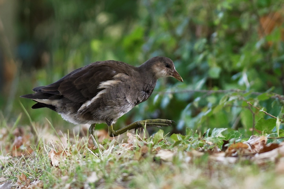 Photo prise le 17/09/2016. Cette Gallinule poule-d'eau juvénile vaquait à proximité et est même venus jusqu'à nos pieds. On peut remarquer les pattes vertes aux très longs orteils. Visitez ma galerie Flickr. Lire Observer les oiseaux dans la réserve ornithologique du Teich.