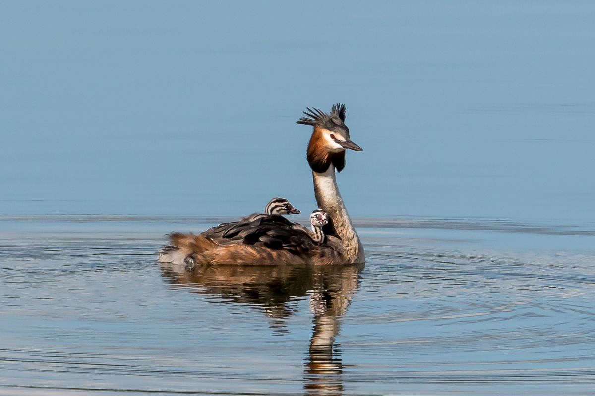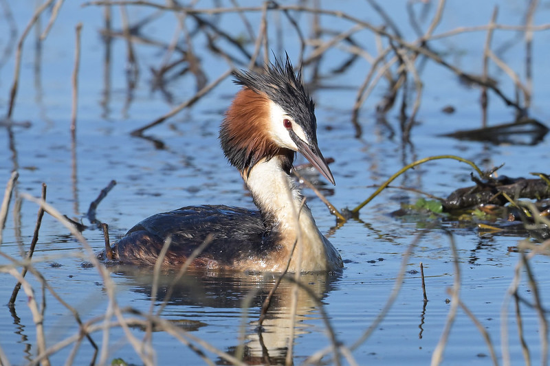 Photo prise le 26/05/2022. Depuis les parades nuptiales aux premières naissances, construction des nids, affrontements avec les rivaux ou avec les foulques nichant dans le même secteur, ces grèbes sont un régal à observer, même s'ils ne sont pas toujours faciles à photographier.