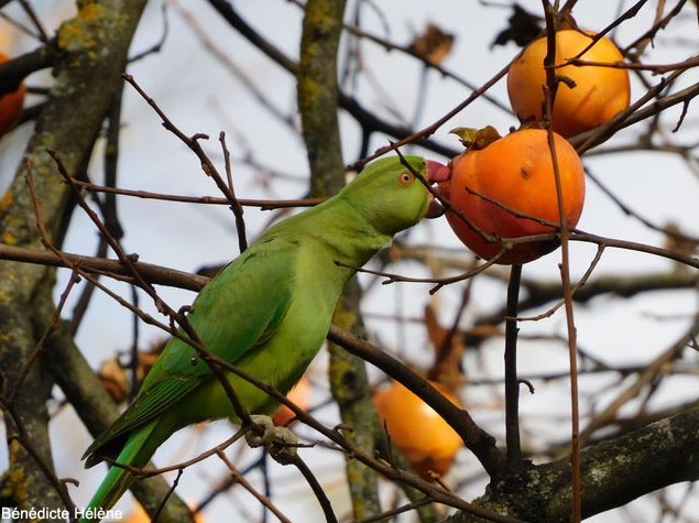 Photo prise à la mi-novembre 2020 par Bénédicte Hélène. Le kaki est le fruit du Plaqueminier du Japon (Diospyros kaki), et il est produit d'octobre à janvier. Il est apprécié par des nombreux oiseaux. Lire