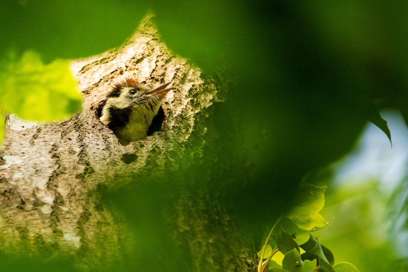 Jeune Pic mar sortant la tête de son nid