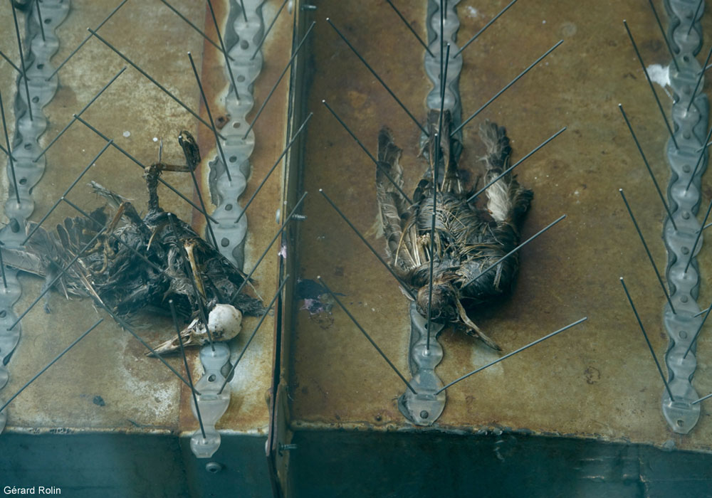 Photographie prise par Gérard Rolin en avril 2022. Plusieurs étourneaux étaient empalés dans les protections anti-pigeons posés sur les bâtiments de l'aéroport.