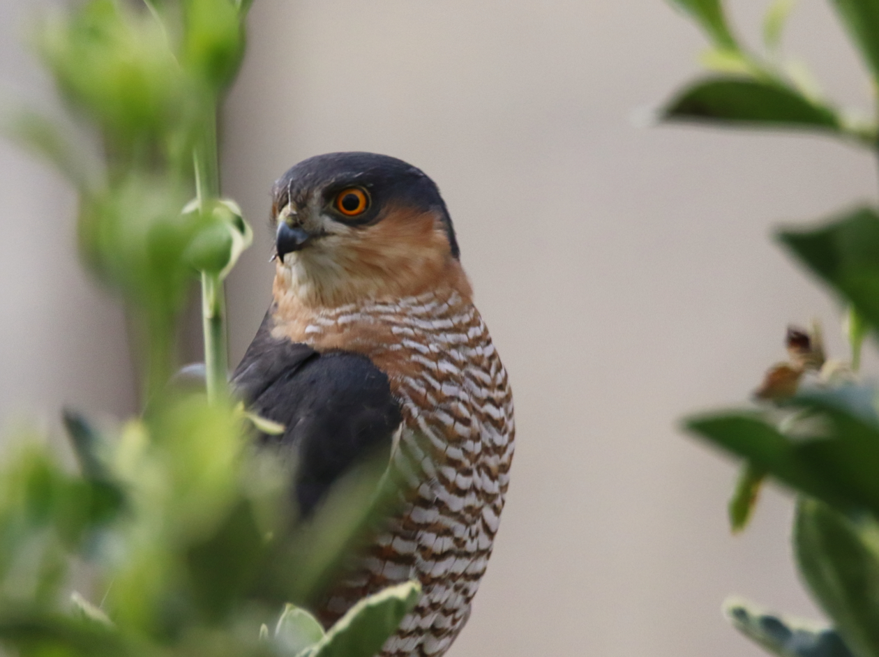 Photo prise le 17/02/2022 : ce mâle vient chasser à proximité de la mangeoire. Lire L’Épervier d’Europe : un rapace opportuniste de plus en plus urbain.