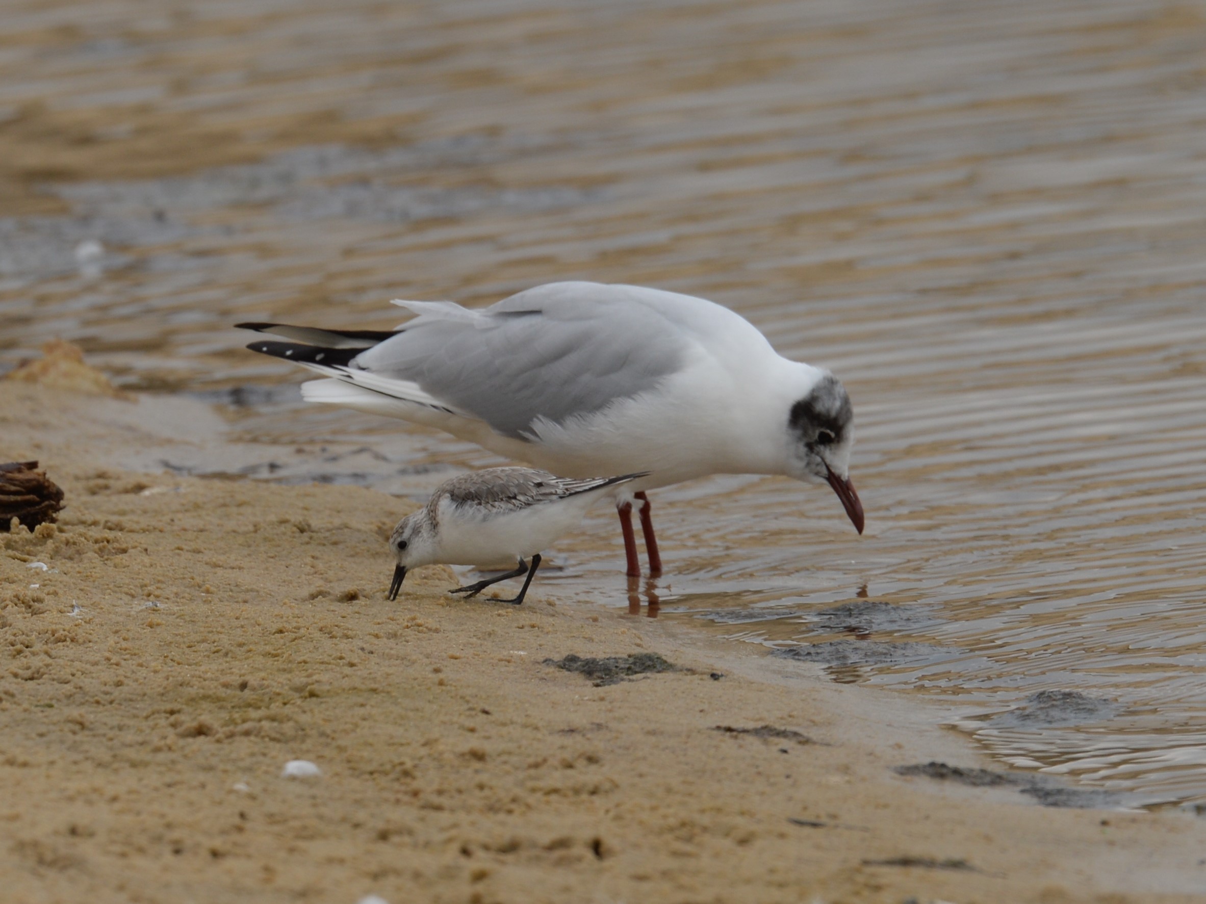 Photo prise le 11/02/2022. Ils sont à la recherche de vers, et la Mouette piétine le sable pour faire remonter son repas (lire Un Goéland argenté semble « danser » à la demande pour obtenir des frites).