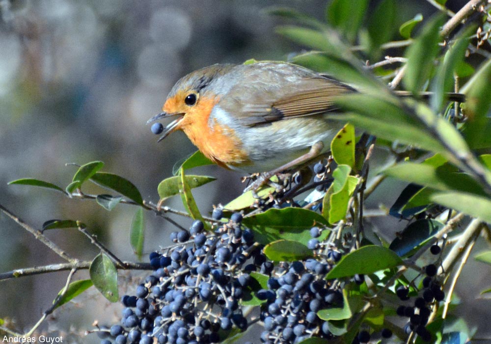 Photo prise le 26/01/2021 par Andréas Guyot. En automne et en hiver, quand les invertébrés sont moins nombreux, le Rougegorge familier élargit son régime alimentaire et mange aussi des petites graines (lire Comment nourrir les oiseaux en hiver ?) et des baies riches en vitamines et en antioxydants (lire Des fruits riches en antioxydants dans votre jardin pour les oiseaux), comme celles du Troène du Japon (Ligustrum japonicum), une espèce d'origine asiatique à la croissance rapide, mais qui peut avoir tendance à être invasif et dont les fruits sont toxiques pour l'Homme.
