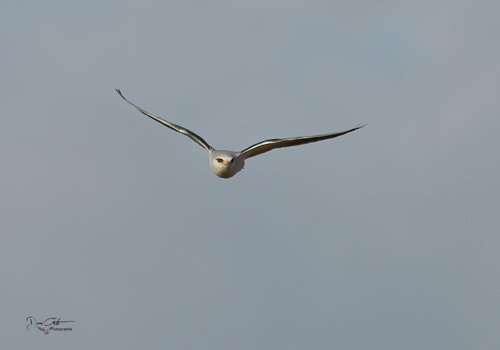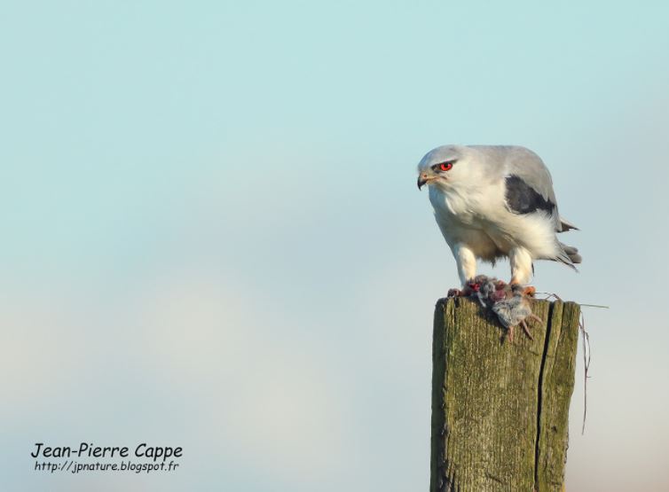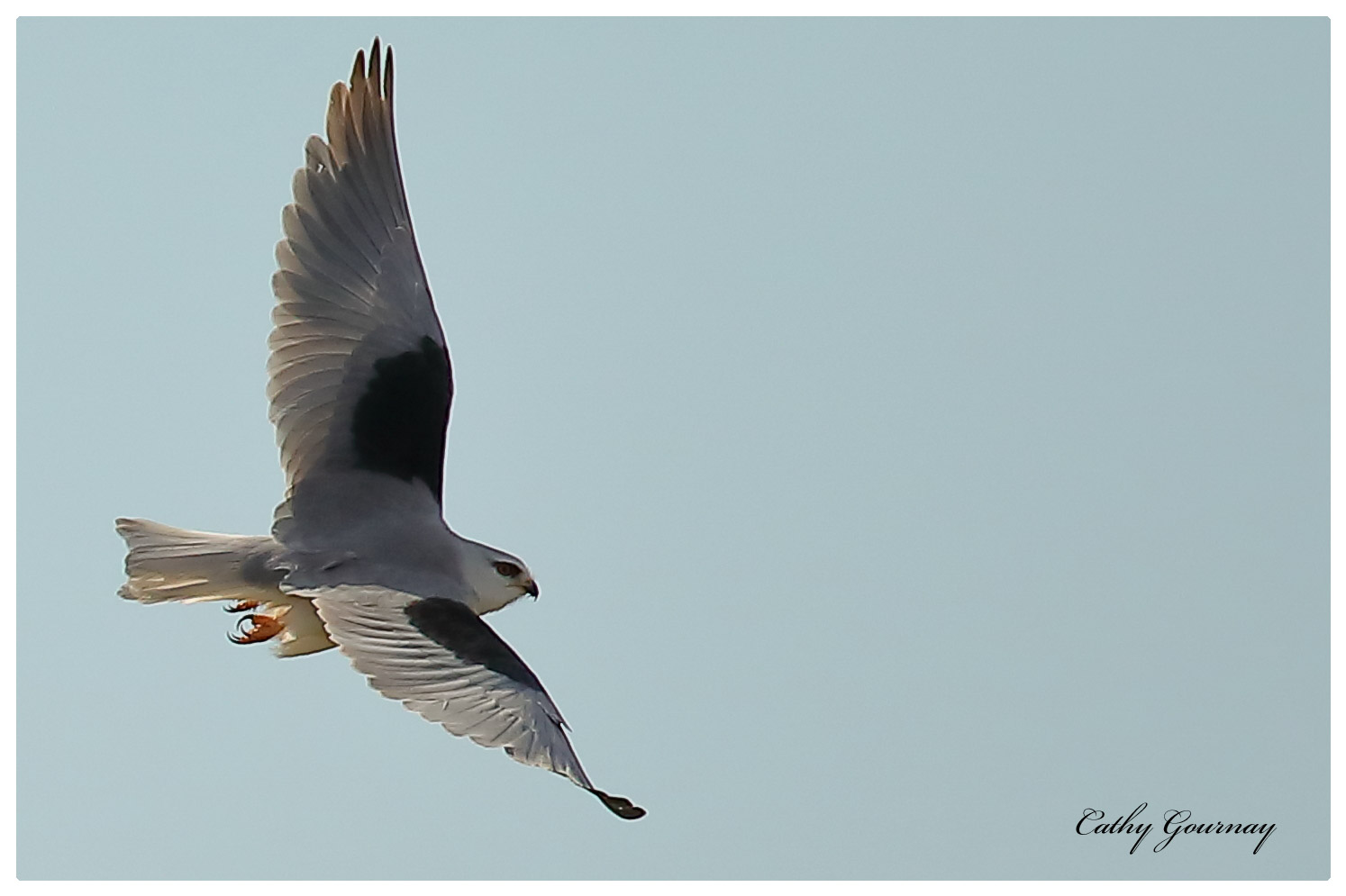 Photo prise le 25/01/2021. L'oiseau survolait une pâture privée, lui servant de lieu de chasse aux rongeurs, appartenant à une charmante dame qui m'a donné l'autorisation d'installer ma tente affût que j'ai habitée plusieurs heures, jouissant ainsi d'une position privilégiée. La chance m'a souri à trois reprises, l'élanion se posant à une vingtaine de mètres de moi, pour déguster ses différentes proies. Voir mon site web Oiseaux.