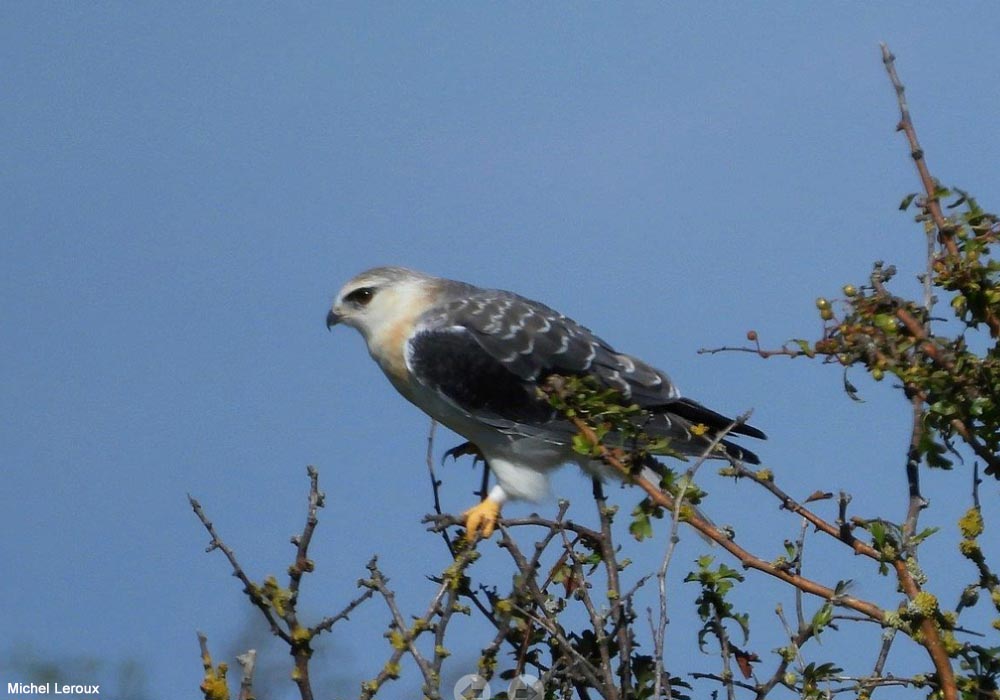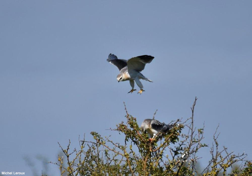 Photo prise le 8 juillet 2022 par Michel Leroux. L’Élanion blanc est un petit rapace au plumage typique gris-bleu, noir et blanc. Son aire de répartition est essentiellement tropicale (Afrique subsaharienne, Asie du sud et du sud-est), et plusieurs sous-espèces sont reconnues dans cette vaste zone. À partir de l’Afrique subsaharienne, l’Élanion blanc a colonisé l’Afrique du Nord puis le sud-ouest de l’Europe (péninsule ibérique et France) (lire L’Élanion blanc poursuit sa forte progression en Europe et au Moyen-Orient). En France, le premier cas de nidification connu remonte à 1990 dans les Pyrénées-Atlantiques, et depuis, l'espèce est en pleine progression dans l'hexagone, et il y aurait désormais entre 604 et 986 couples (source : Jacques Comolet-Tirman et al).