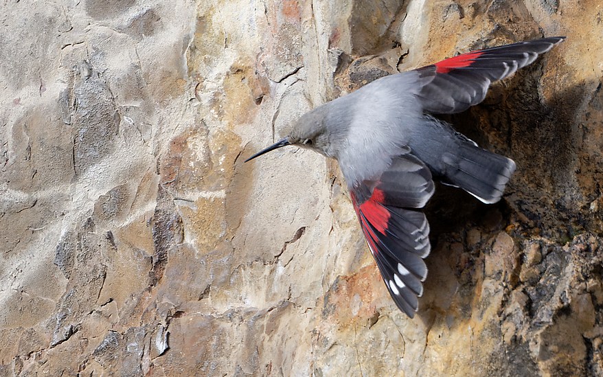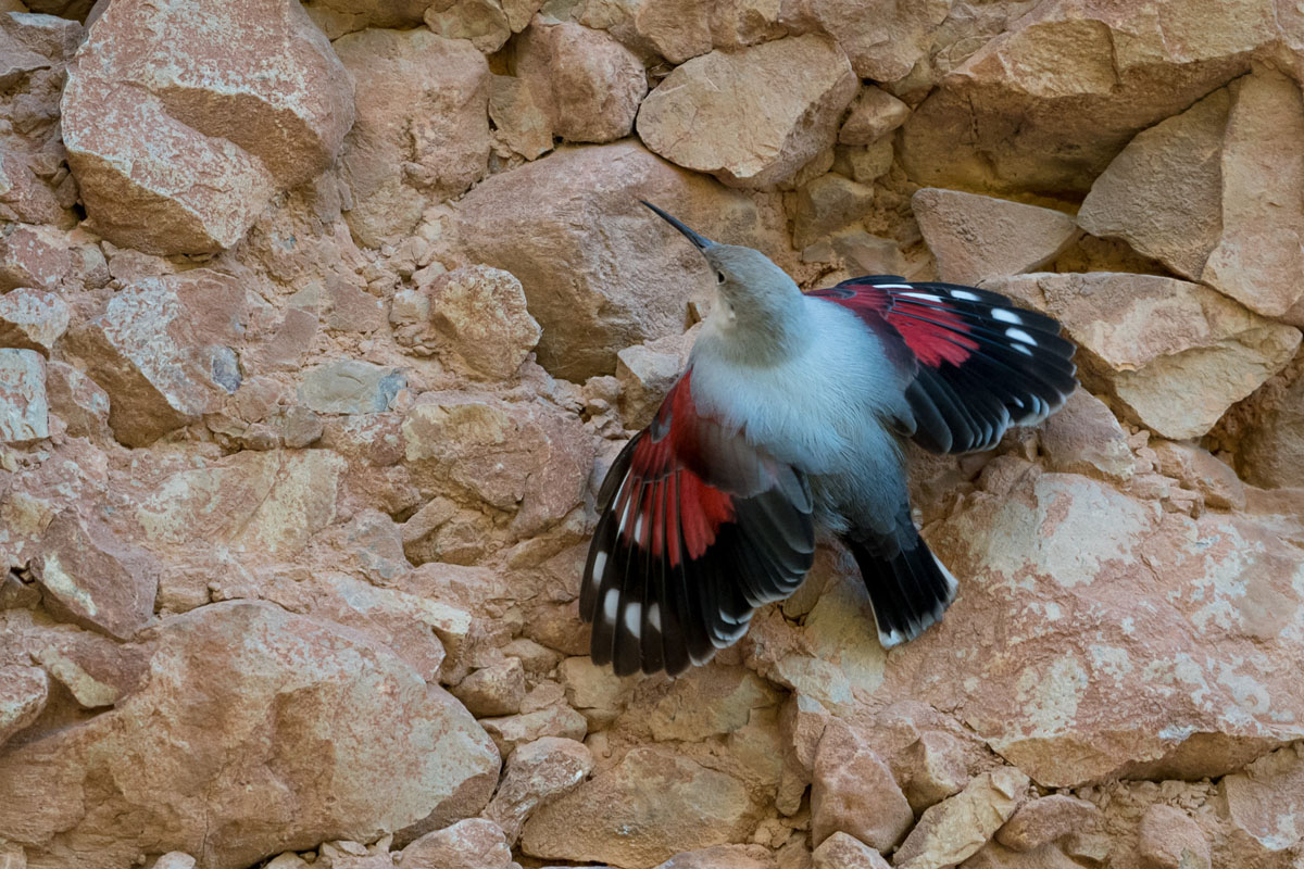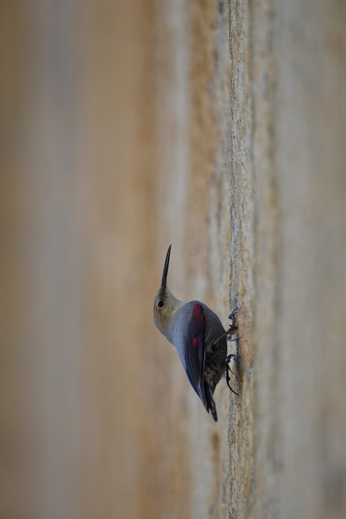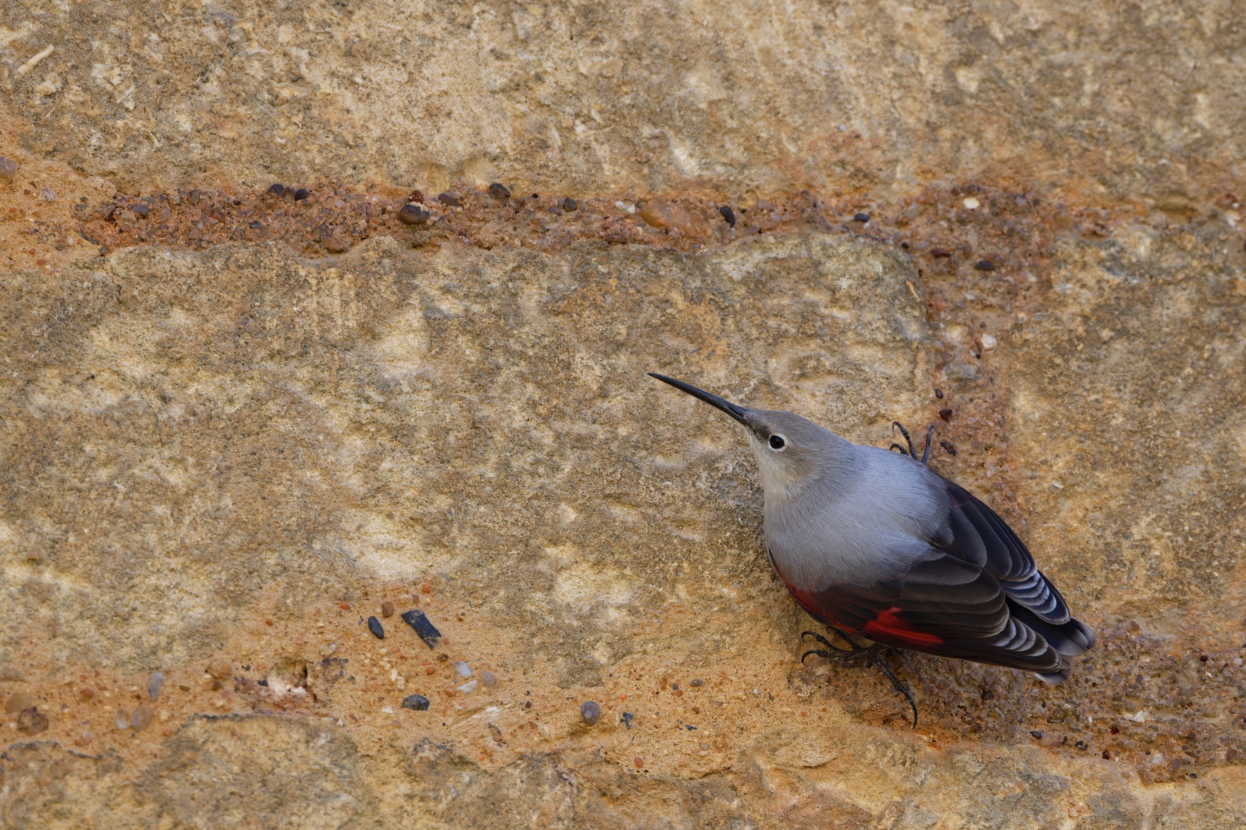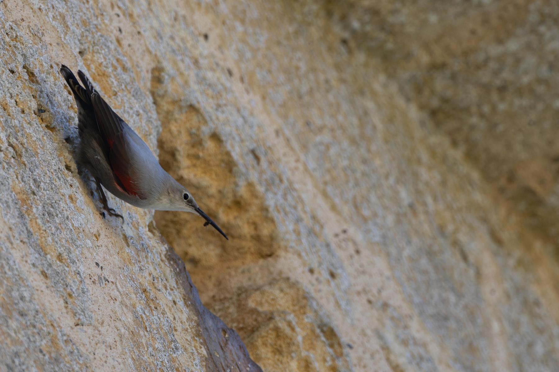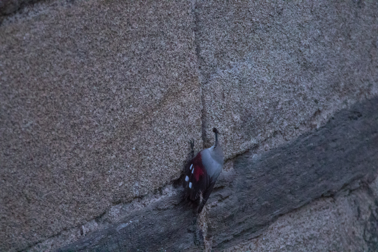 Photo prise le 17/11/2021. En automne et en hiver, le Tichodrome échelette descend à une altitude inférieure, et on peut alors l'observer sur des formations rocheuses naturelles, comme les Mallos de Riglos en Aragon (Lire Deux secteurs à visiter près de Huesca (Aragon)), ou sur des vieux bâtiments (lire Le Tichodrome échelette, un « amateur » du patrimoine culturel français).