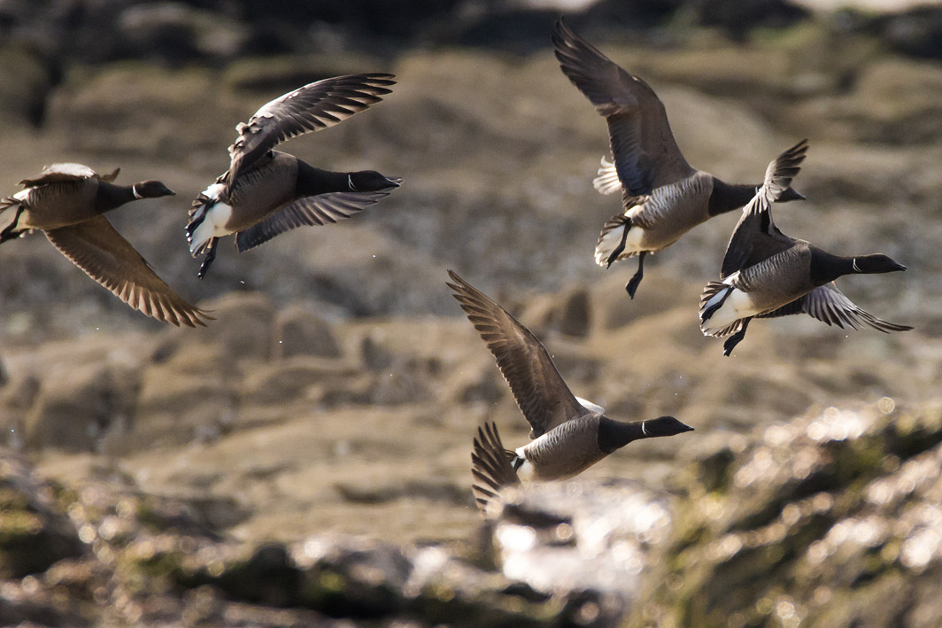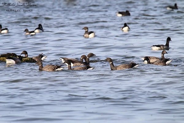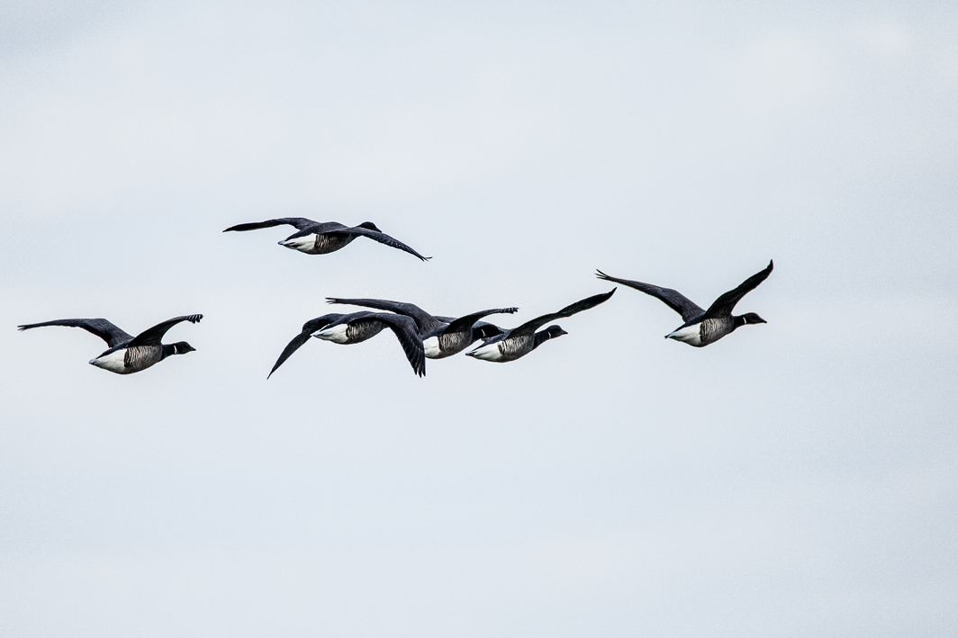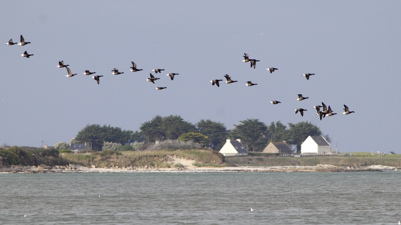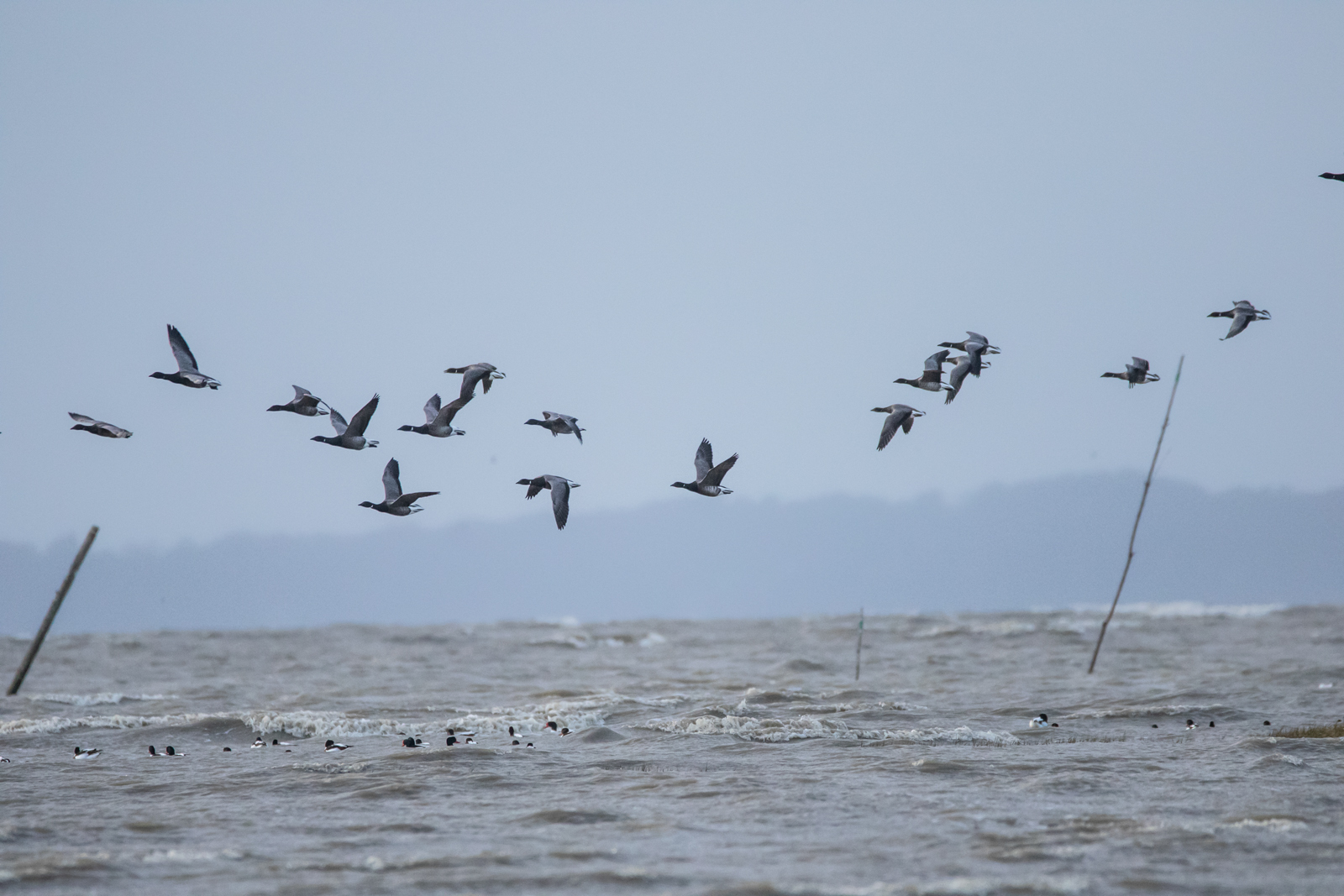 Photo prise le 26/02/2020. Bernaches cravants passants au dessus de Tadornes de Belon.