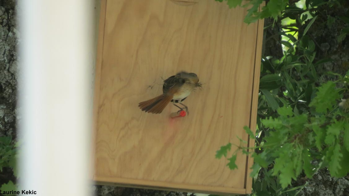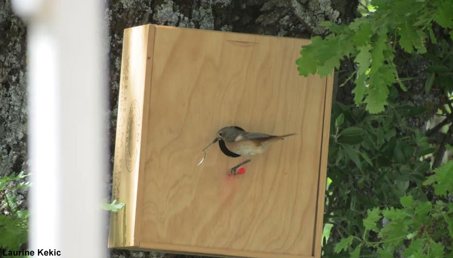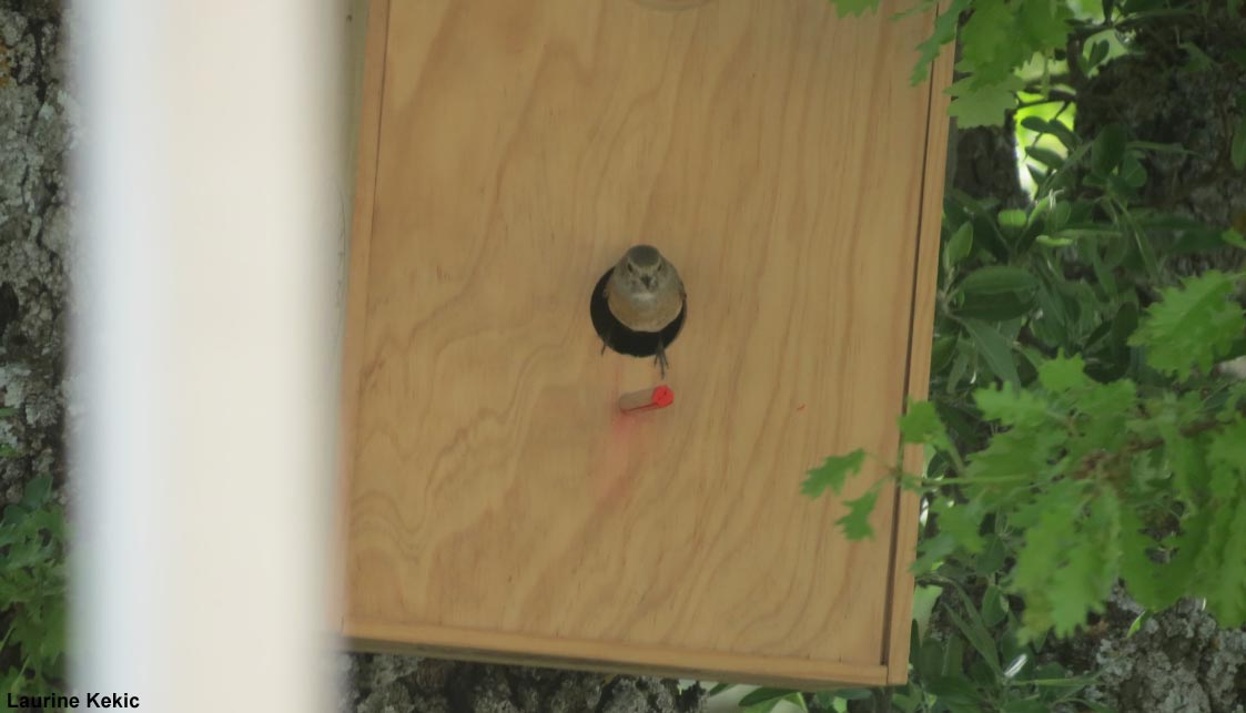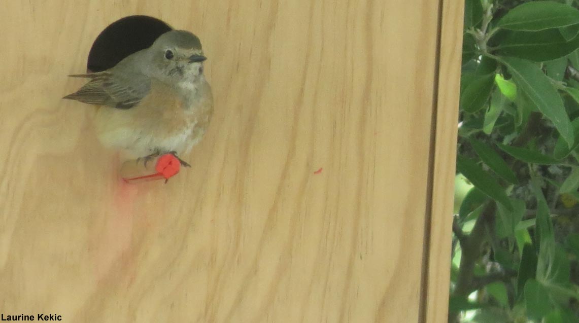 Rougequeue à front blanc femelle à l’entrée de son nichoir