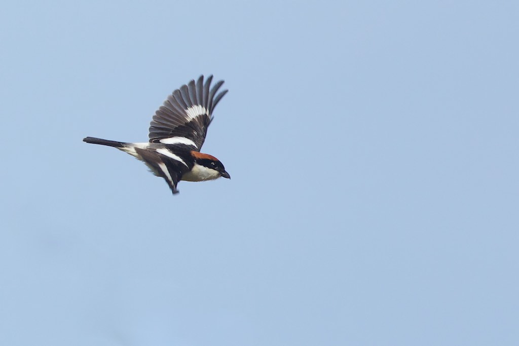Pie-grièche à tête rousse en vol