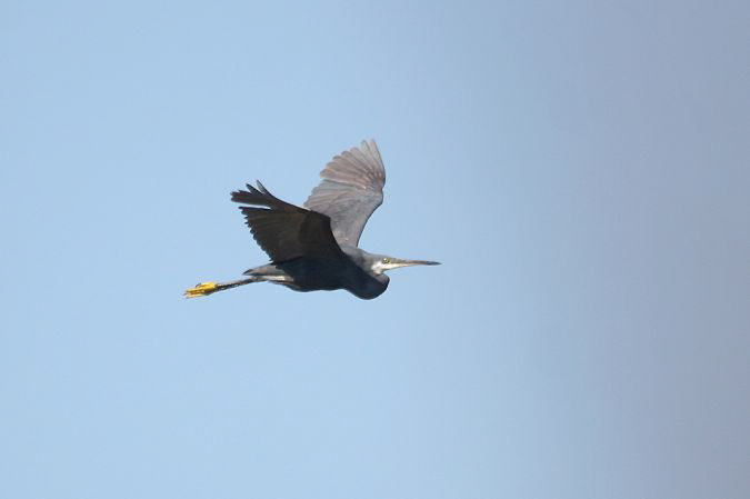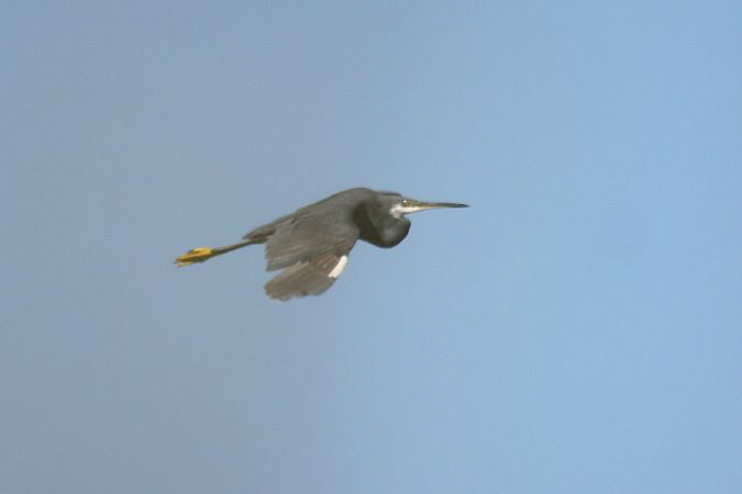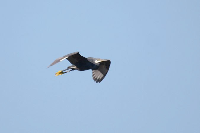 Photo : Vincent Palomares. Oiseau apparemment "pur". Arrive du nord en direction de la colonie mixtes d'Ardéidés de la réserve du Scamandre. Cet oiseau présente deux couvertures primaires externes blanches sur son aile droite. Lire Identifier et chercher l'Aigrette des récifs en Europe de l'Ouest et L'impressionnante progression de l'Ibis falcinelle en Camargue depuis 2006.