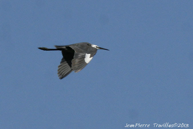 Photo : Jean-Pierre Trouillas (COGard) (visitez le site web de Jean-Pierre Trouillas). Hybride Aigrette des récifs x Aigrette garzette. L'oiseau diffère de celui vu près de l'étang du Charnier par ses larges plages alaires blanches. Lire Identifier et chercher l'Aigrette des récifs en Europe de l'Ouest et L'impressionnante progression de l'Ibis falcinelle en Camargue depuis 2006.