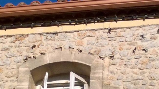 Photo publiée le 7 avril par Hubertine Auclert (visitez sa page Facebook). Tous les matins, elles viennent s'accrocher sur la façade de sa maison, au dessus des fenêtres et sur les fils électriques Elles prennent un bon bain de soleil (après des nuits encore fraîches) avant de partir chasser et de poursuivre la construction de leurs nids.