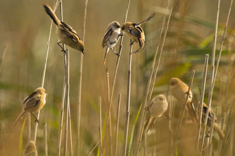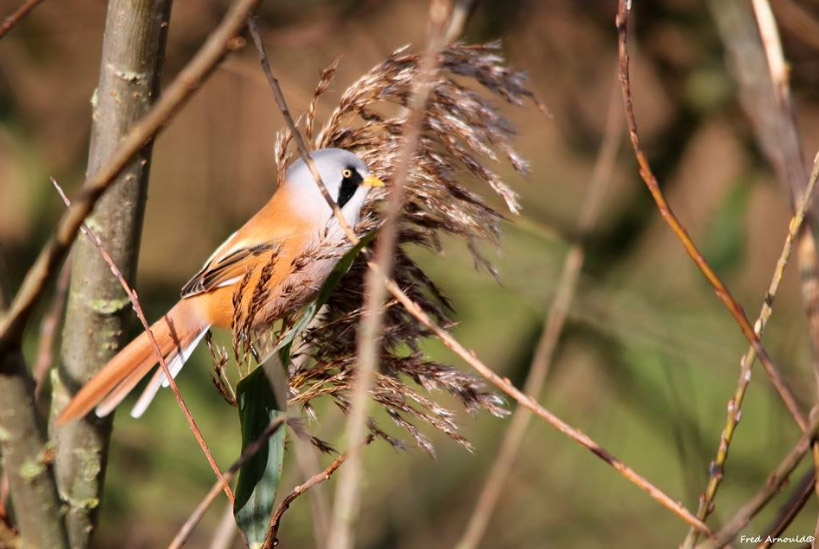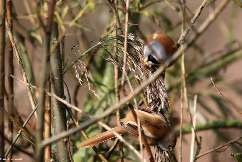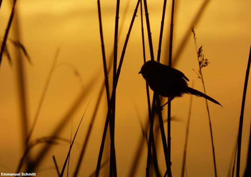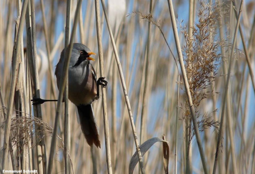 Photo prise en 2013 par Emmanuel Schmitt (voir sa page Facebook). Des groupes de 5 à 10 Panures à moustaches sont régulièrement observables dans les marais de la Touques en automne, et en hiver, ils peuvent atteindre plusieurs dizaines d'oiseaux (lire Le marais de la Touques : l'ornithologie "aux portes des casinos").