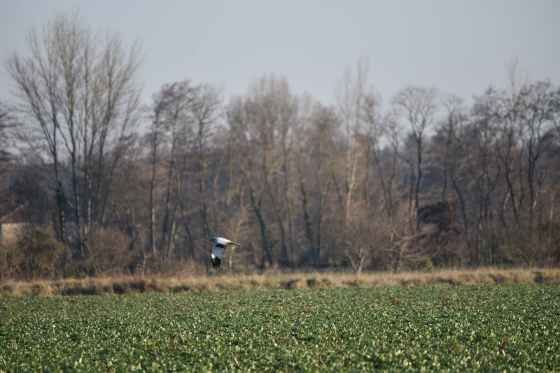 Photo réalisée le 15/06/2014 lors du suivi de la nidification des Busards Saint-Martin dans le Vexin. Le busard mâle chasse une corneille s'approchant du nid. Lire Corvidés et rapaces, des ennemis farouches ?/a>.