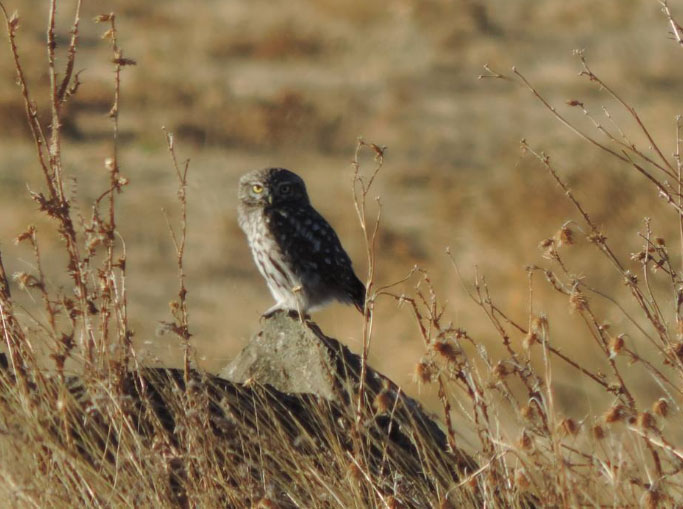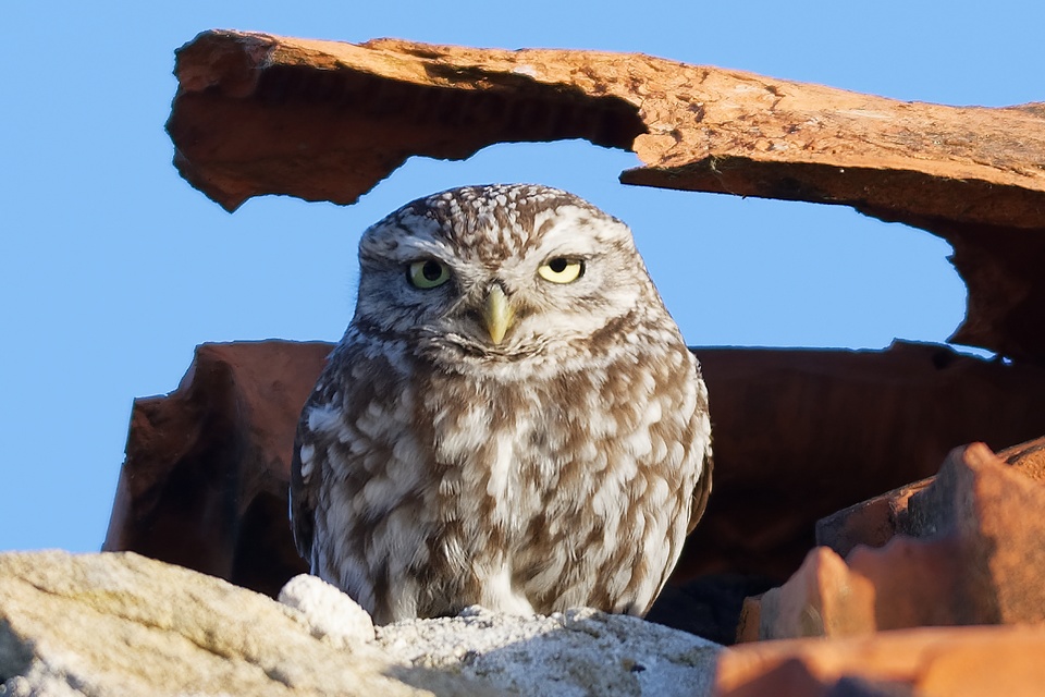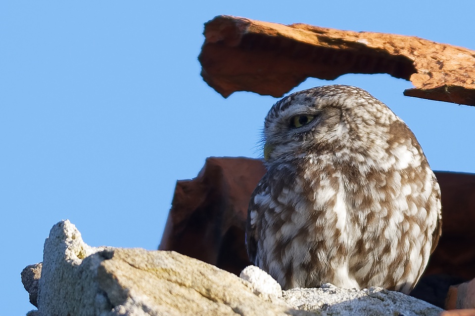 Chevêche d’Athéna prenant le soleil au crépuscule