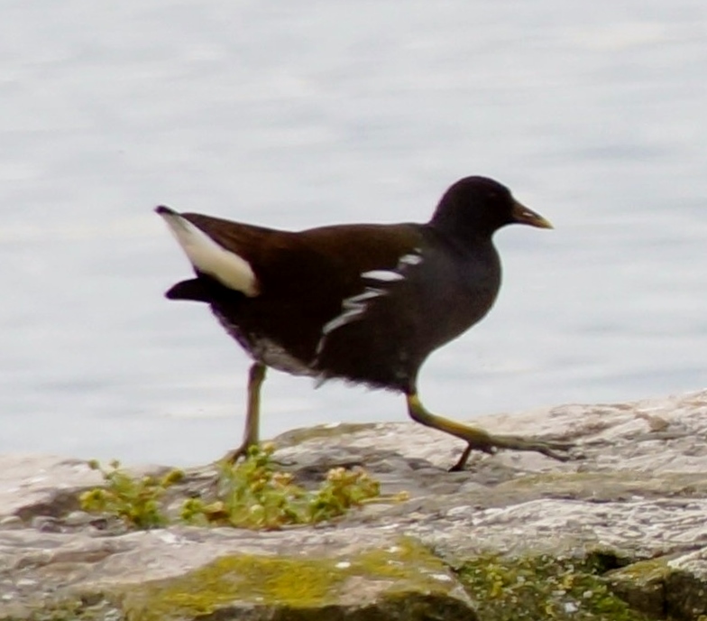 Photo prise le 15/10/2014. Taille moyenne, sombre, avec queue assez longue, longues pattes vertes et longs orteils, bec rouge à pointe jaune, gris ardoise foncé, dessus à nuance brune, ligne blanche le long des flancs et sous-caudales latérales blanches.