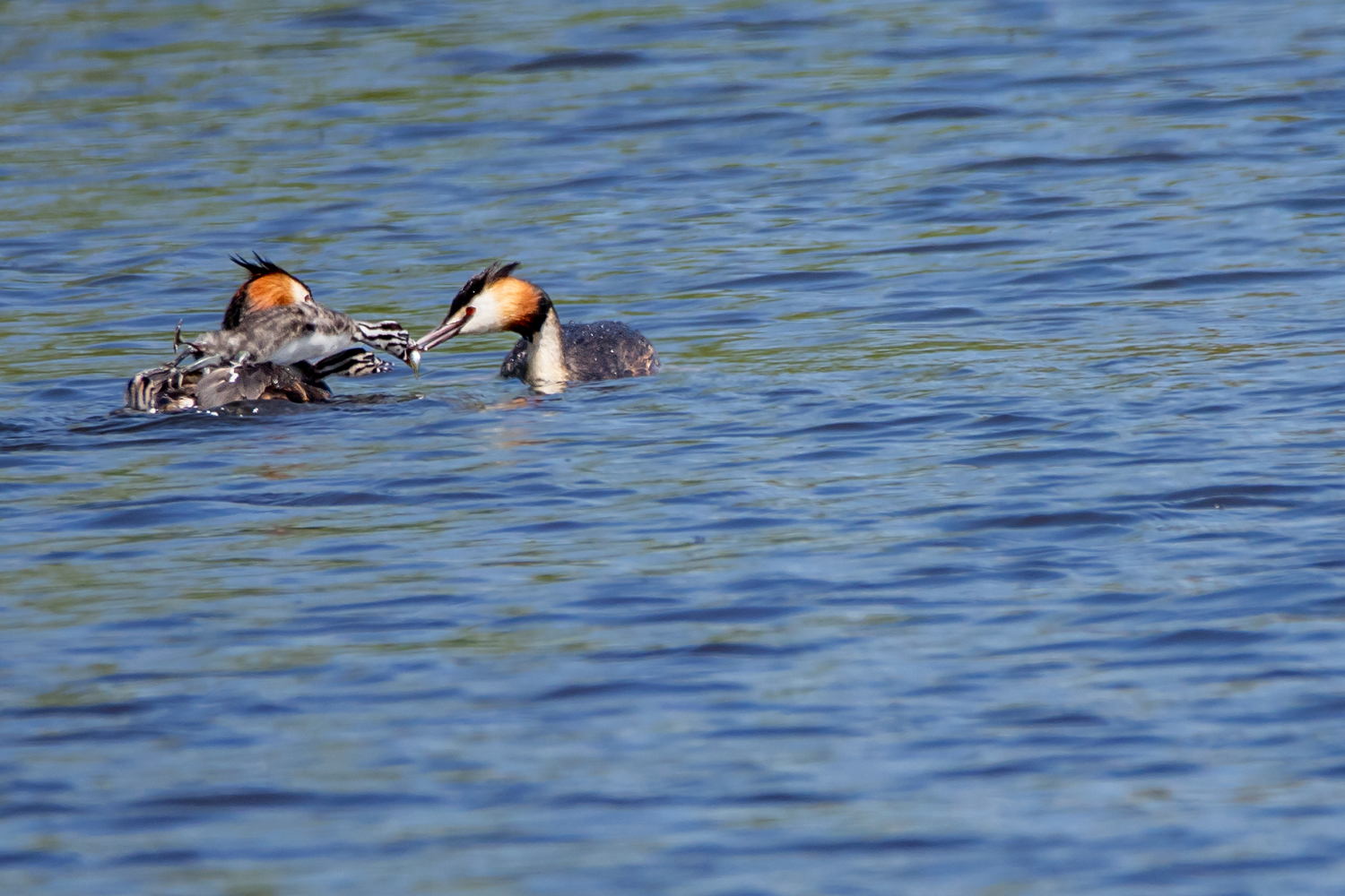 Grèbe huppé nourrissant son poussin