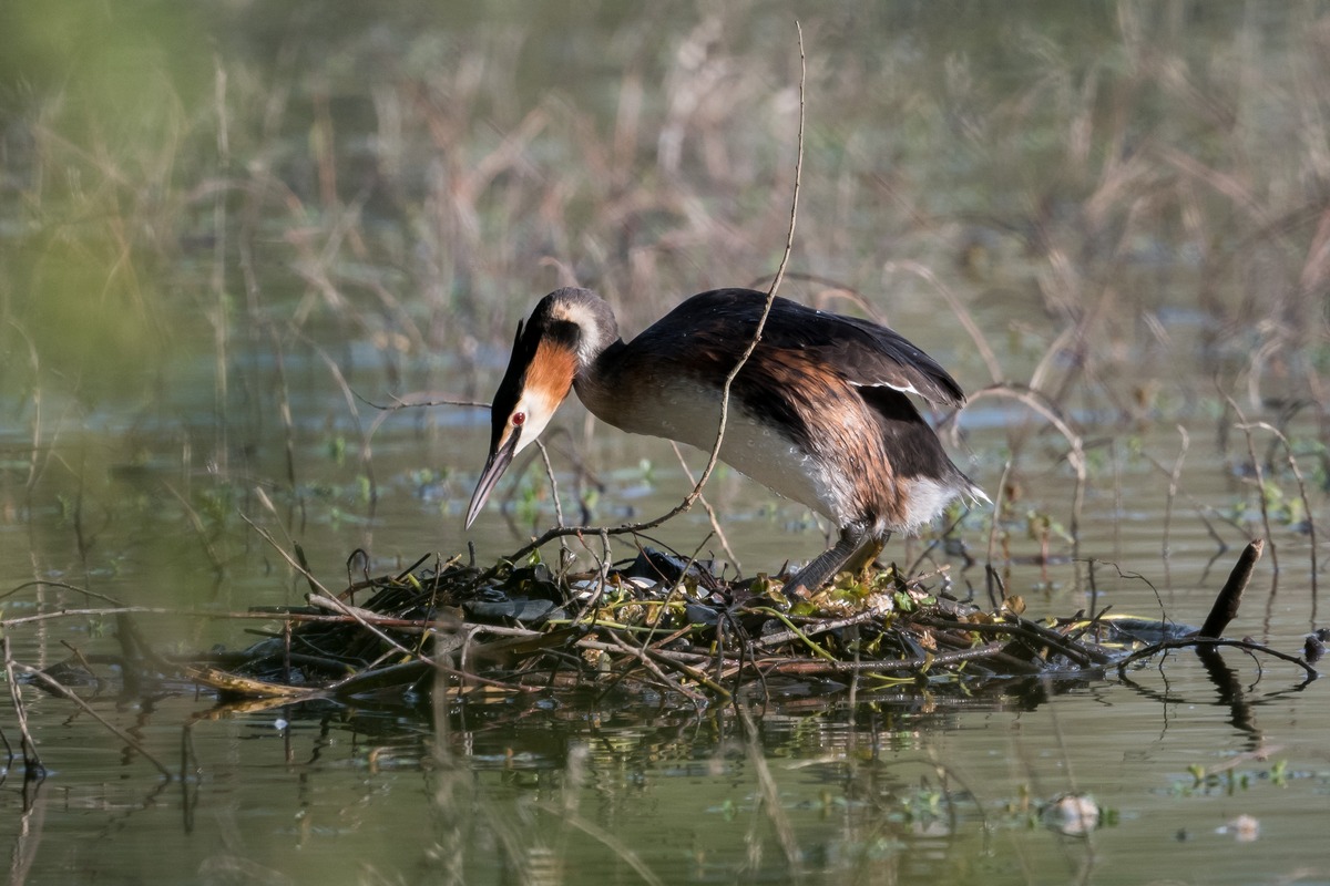 Grèbe huppé sur son nid