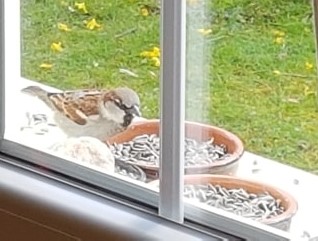 Photographie prise le 04/04/2019 par Madame haie Marie-José . Toujours sur le bord de ma fenêtre, c'est le restaurant des oiseaux avec graines de tournesol et boules de graisse. Lire Nourrir les oiseaux sur son balcon en hiver.