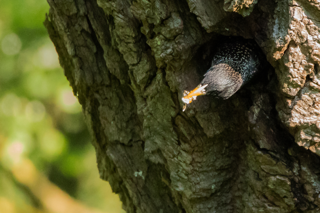 Etourneau sansonnet sortant du nid avec un sac fécal