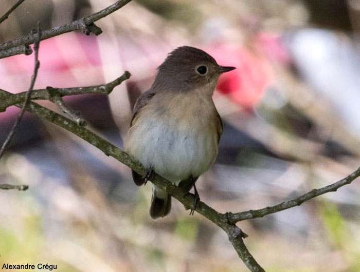Photo prise le 13/10/2020 par Alexandre Crégu. Le Gobemouche nain est un petit passereau forestier avec une queue noir et blanche souvent agitée de haut en bas et un cercle oculaire pâle. L'oiseau de première année se distingue par une gorge beige et non pas blanche, les lisérés pâles sur ses rémiges tertiaires et un croupion plus noir que le dessus sombre de la queue. Cette espèce est observée en petit nombre chaque automne (avec un pic en octobre) sur les îles bretonnes, dont celle d'Ouessant (Finistère) (lire Visiter l’île d’Ouessant : bons coins et carte à imprimer).