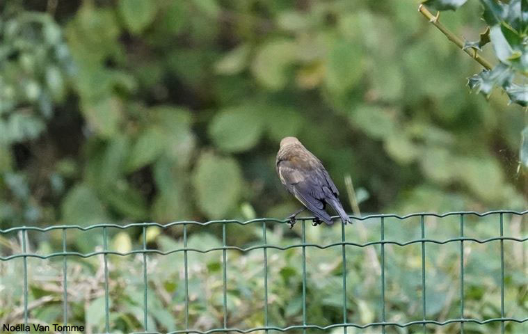 Photo prise le 02/08/2020 par Noëlla van Tomme dans son jardin. Cet oiseau était plus sombre que les autres, mais il n'était probablement pas mélanique, car ses pattes et son bec était également touchés, or le mélanisme ne concerne que le plumage (rappel de Hein van Grouw). Son plumage était donc probablement simplement sali par de la suie ou par une autre substance, comme cela avait été noté chez une Mésange charbonnière (Parus major) en Ardèche en avril 2020 (lire Une Mésange charbonnière couleur de suie et qui mérite donc vraiment bien son nom).