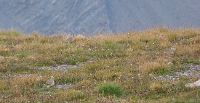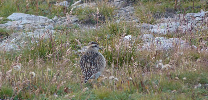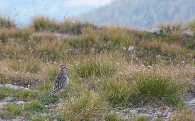 Photo prise le 30/08/2016. Jeune en halte migratoire sur les pelouses sommitales, avec en toile de fond le Queyras et la frontière italienne. Il y avait 7 Pluviers guignards (3 adultes et 4 jeunes). La cohésion du groupe était constamment maintenue par de petits cris discrets émis sans cesse par les oiseaux. Deux jeunes se sont approchés très près. Lire Quelques conseils pour rechercher le Pluvier guignard en migration et voir une synthèse des observations de Pluviers guignards en France.