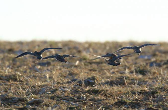 Photo prise le 28/08/2017. Cinq oiseaux (1 adulte et 4 juvéniles) posés dans un champ. Lire Quelques conseils pour rechercher le Pluvier guignard en migration.