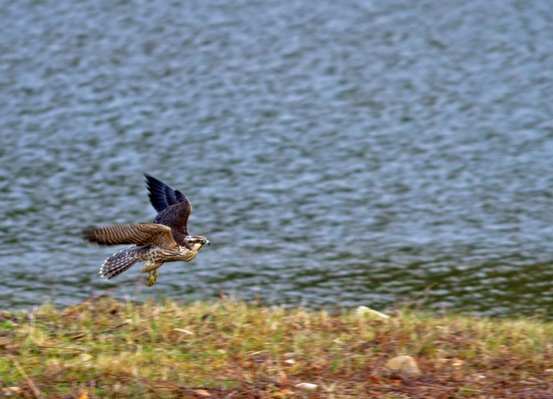 Photo prise le 01/04/2016. Le Faucon pèlerin, qui venait de capturer une proie (indéterminée), a été pris en chasse par 2 Goélands argentés, dont l'un l'a littéralement alpagué, jusqu'à lui faire lâcher sa proie.